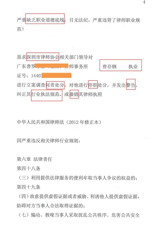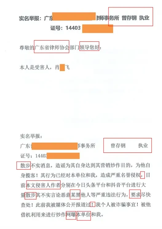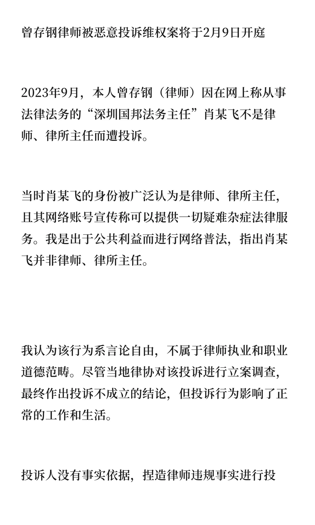 2023年9月,本人曾存钢(律师)因在网上称从事法律法务的“深圳国邦法务主任”肖某飞不是律师、律所主任而遭投诉。