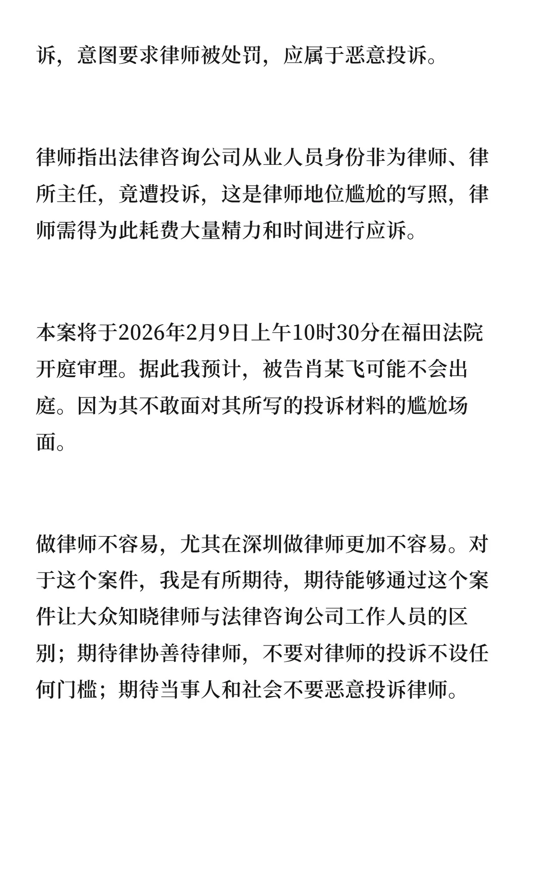 本案将于2026年2月9日上午10时30分在福田法院开庭审理。据此我预计,被告肖某飞可能不会出庭。因为其不敢面对其所写的投诉材料的尴尬场面。