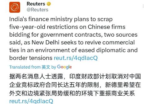 美国估计又要不高兴了!中印关系这一次往前面迈了一大步!1月9日,根据外媒报道,两名知情人士透露,印度财政部计划取消针对中国企业参与印度政府合同竞标、已实施五年的限制措施。外媒表示,此举正值中印两国外交关系缓和、边境紧张局势降温之际,新德里方面希望借此重振双边经贸联系。   2026年1月9日,印度财政部一则取消中国企业参与政府项目限制的消息,让国际舆论场炸开了锅。   这个被外媒称为“印度五年内最大让步”的动作,发生在中印边境局势降温、外长年内四次会晤的节点上——曾经剑拔弩张的邻居,正用实际行动证明:比起跟着美国画的“对抗大饼”,填饱自家肚皮更重要。   时间倒回2020年加勒万河谷冲突后,印度掀起一轮“去中国化”狂潮:封禁200多个中国APP,限制中企参与基建招标,甚至要求政府项目“零中企”。   结果呢?2023财年印度吸引外资暴跌62%,电子制造业因缺少中国技术人员直接损失150亿美元。班加罗尔的芯片工厂负责人私下坦言:“不让中国工程师进来,生产线直接停摆,美国承诺的技术援助至今没影儿。”   莫迪政府终于算清了账:2025年中印贸易额突破1400亿美元,中国连续7年稳居印度最大贸易伙伴。   去年印度恢复中国旅游签证,加尔各答直飞广州的航班复航,电子业技术人员开通“绿色通道”——这些小动作背后,是印度制造业对中国供应链的深度依赖。正如印度首席经济顾问直白的警告:“不融入中国供应链,就别想融入全球市场。”   美国的焦虑写在明面上。2025年五角大楼的军力报告罕见直白:“中国正用边境缓和阻止美印走近。”   可讽刺的是,过去三年美国一边拉着印度搞“四方安全对话”联合军演,一边对印度钢铁加征50%关税,甚至因印度购买俄油威胁制裁。这种“既要你当枪使,又要薅你羊毛”的操作,让新德里彻底寒心。   莫迪不是没挣扎过。2024年他尝试用美国设备替代中国光伏组件,结果本土企业成本飙升30%,项目进度拖延半年。   印度战略研究中心的报告戳穿真相:“美国给的是军火订单,中国给的是就业机会。当孟买贫民窟的孩子需要便宜的中国疫苗时,华盛顿的‘价值观同盟’一文不值。”   最微妙的变化,发生在边界问题的谈判桌上。印度悄悄把“恢复2020年前原状”的强硬立场,换成了“维护实控线和平”。   这种转变,源于34轮军长级会谈后的共识:西段边境的帐篷拆了,巡逻热线24小时畅通,连士兵相遇时都会点头致意。一位参与谈判的印度官员透露:“我们终于承认,靠军事对峙换不来领土利益,不如坐下来谈贸易互惠。”   这种务实同样体现在多边场合。2025年上合峰会期间,中印共同推动本币结算试点,在数字经济、绿色能源领域签署合作备忘录。当美国记者追问莫迪“是否担心中国影响力”时,他的回答耐人寻味:“印度需要的是发展伙伴,不是对抗工具。”   华盛顿显然低估了印度的“战略自主”基因。从尼赫鲁时代延续至今的“不结盟”传统,让新德里始终拒绝成为任何大国的棋子。   2025年印度顶着美国压力续签俄罗斯S-400导弹合同,2026年又在联合国气候大会上与中国联手反对“碳关税”——这些动作,都在告诉美国:印度的外交政策,永远以“印度利益”为圆心。   更让美国焦虑的是“全球南方”的觉醒。当中国提出“龙象共舞”,印度回应“亚洲双引擎”,两国在金砖、上合框架下的合作,正在重塑发展中国家的话语权。美国智库的报告承认:“中印走近不是简单的地缘政治重组,而是新兴经济体对霸权秩序的集体背离。”   站在2026年的开端,中印关系的“回暖”绝非偶然。它是两个10亿级人口大国,在经历对抗阵痛后做出的理性选择——边界争议可以谈,但发展权不能让;   美国的脸色要看,但自家的饭碗更重要。当新德里的决策者开始用“伙伴”而非“对手”定义北京时,华盛顿那些“印太战略”的沙盘推演,注定要被现实撞得粉碎。毕竟在这个充满不确定性的时代,填饱肚子的务实,永远比画饼充饥的对抗,更有生命力。