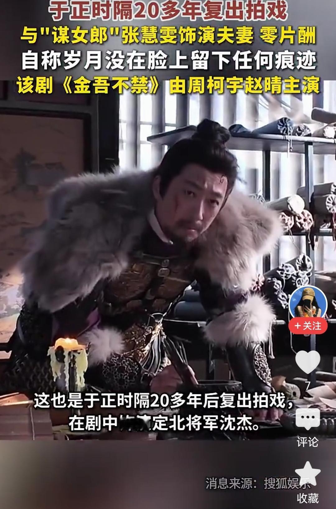 2026开年内娱最抓马的事儿,必须是于正时隔二十多年重新当演员。这位金牌制片人在自己总制片的《金吾不禁》里,零片酬演39岁定北将军,还和张慧雯演夫妻,直接把热搜炸了锅。 47岁的于正为贴合角色减重30斤,专门打磨原声台词,这份投入确实让人佩服。可15岁的年龄差让观众直呼满屏父女感,调侃张慧雯遇上职场工伤。大家还扒出他之前拒绝男主请假,如今自己参演,质疑声瞬间拉满。 剧组赶紧澄清两人没亲密戏,张慧雯只是友情客串。说到底,于正复出既是圆早年演员梦,也是给新剧赚足话题。至于最终是惊喜还是翻车,还得等成片上线才见真章,反正我已经搬好小板凳等着看戏了。