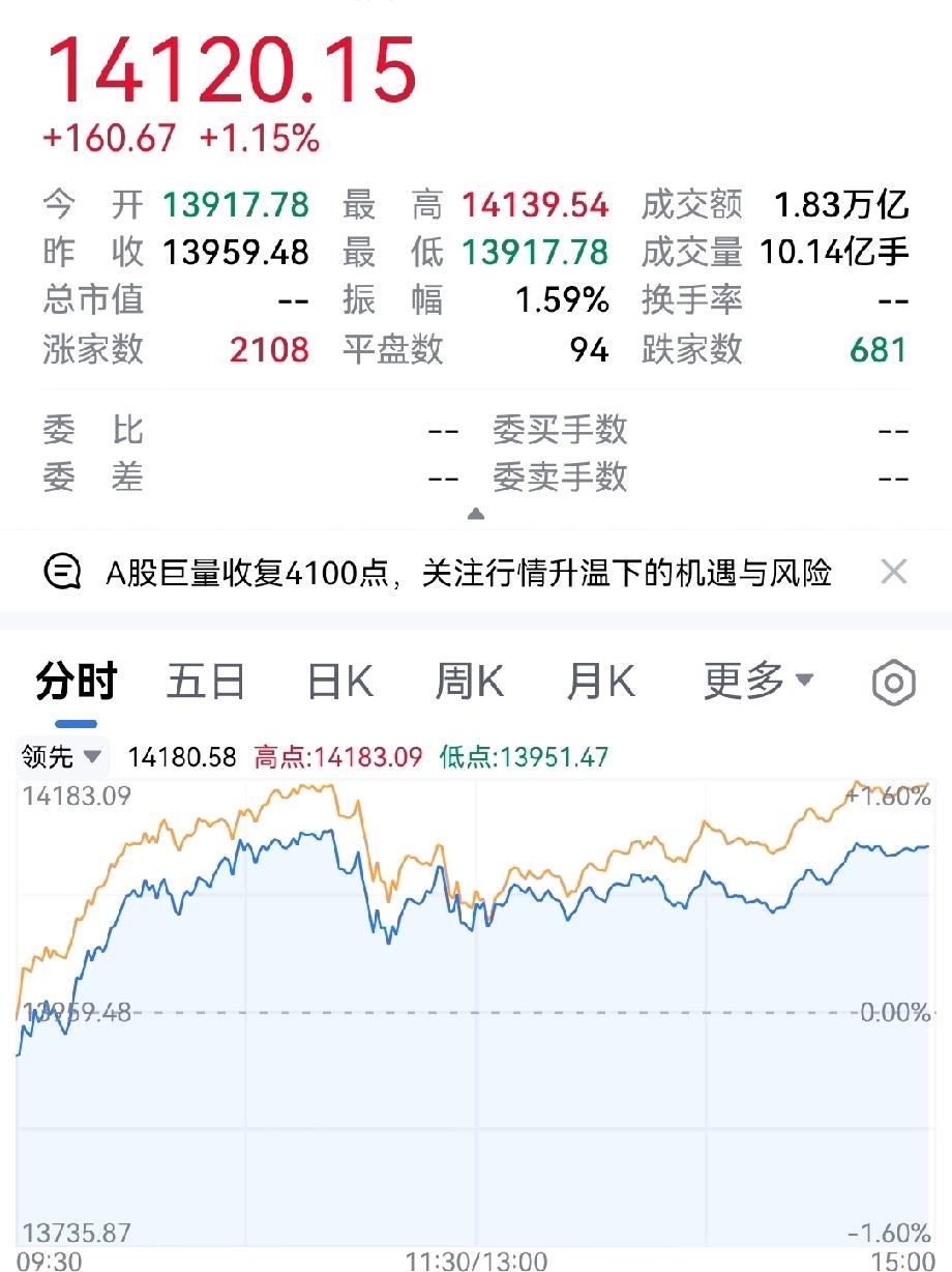 2026年新年以来大盘一路高歌猛进,今天又是放量大涨突破3万亿的成交额,,广告营销、国防军工、有色金属、商业连锁等板块领涨,今日赚钱效应显现,大盘继站稳4050后,一举站上4100点,很多人说大盘涨的这么猛,等回调了再进,春节行情肯定会有一波回调,其实现在上车也没有多大的关系,回调继续补仓,下一步拉升肯定势如破竹,等大盘拉到高点很多人就不敢进了,后面的势头只会越来越猛,当前国际局势变化多端,各种突发事件层出不穷,不确定因素太多,现在正是全球从新洗牌的时候,谁抓住了先机,谁就会赢得未来!目前大A的体量还是太低了,与中国的经济体量完全不对称,普通人只需要跟着国运走,未来肯定会风生水起!