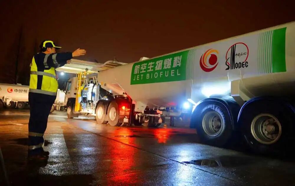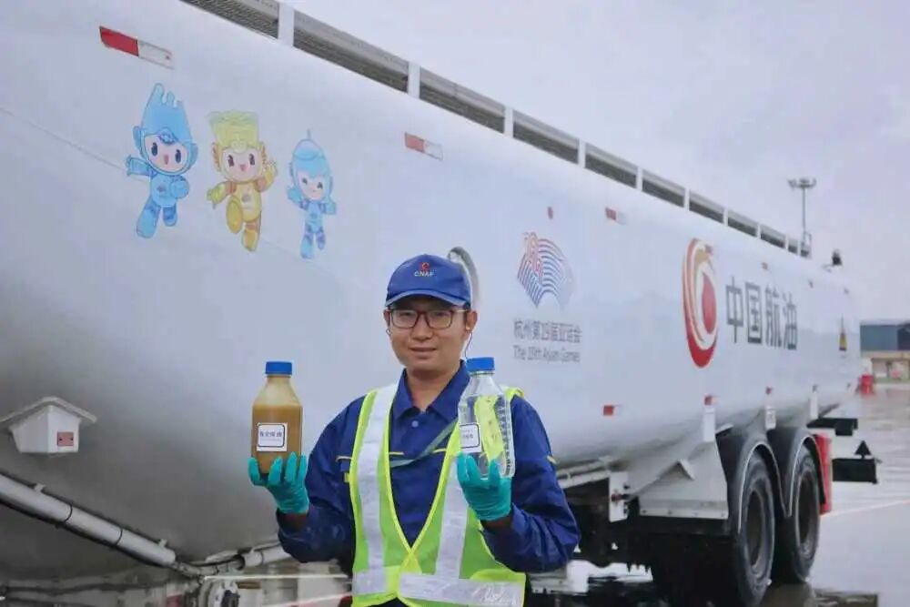 图为中国航油公司员工为航班加注生物航煤。(受访者供图)