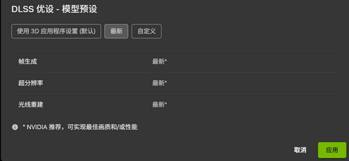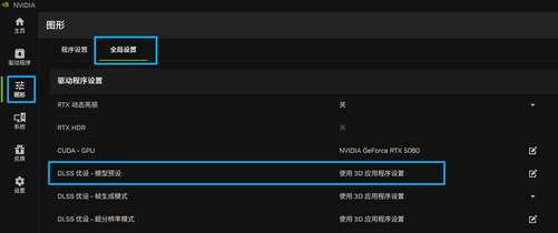 安装完成后,再次打开NVIDIAApp,点击图形-全局设置-DLSS优设-模型预设,然后选择最新即可,这样就是体验全新Transformer模型带来的DLSS4.5超分辨率技术了~