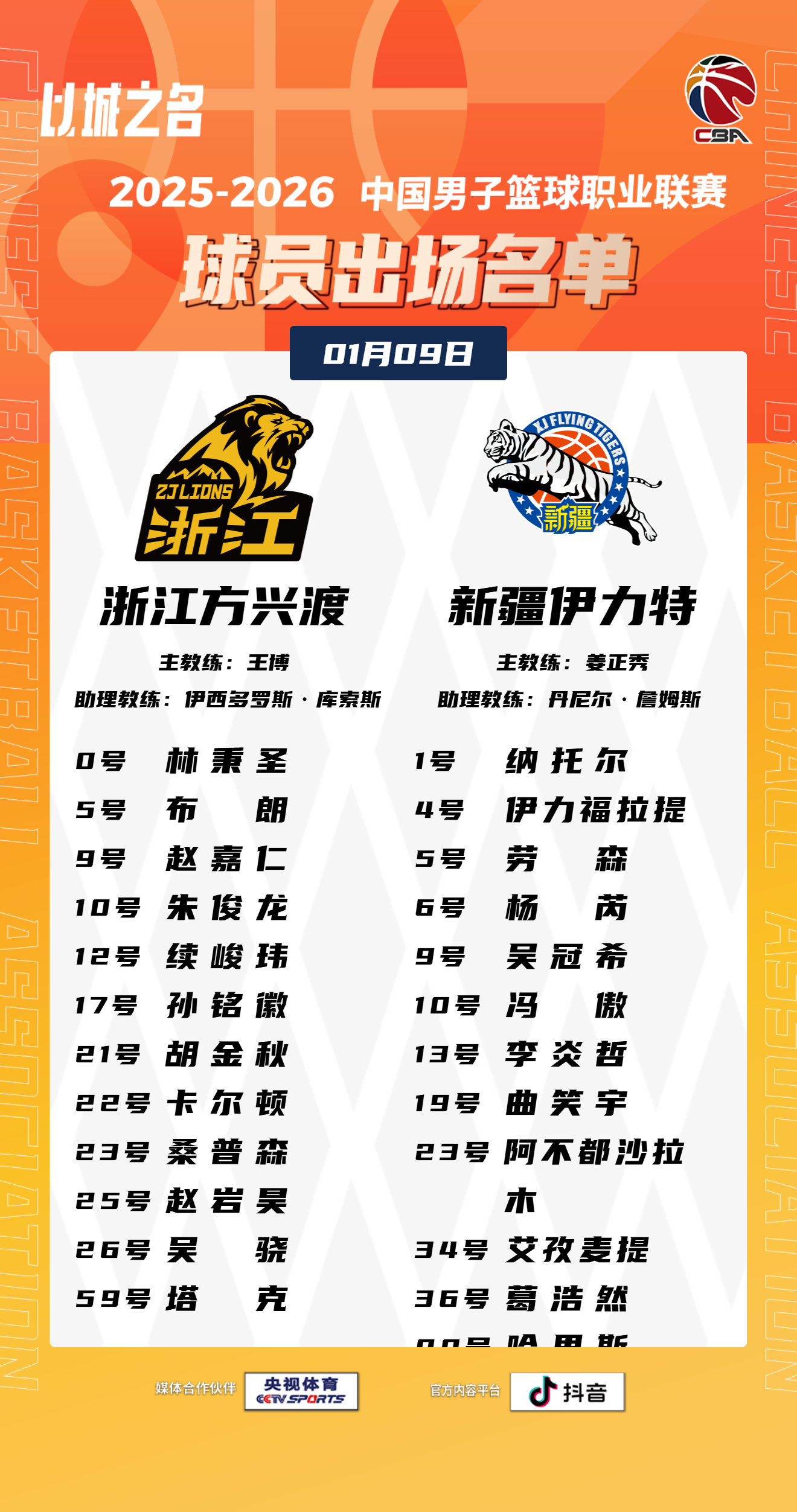 虎扑01月09日讯今日CBA常规赛,广厦对阵新疆的大名单已经出炉。