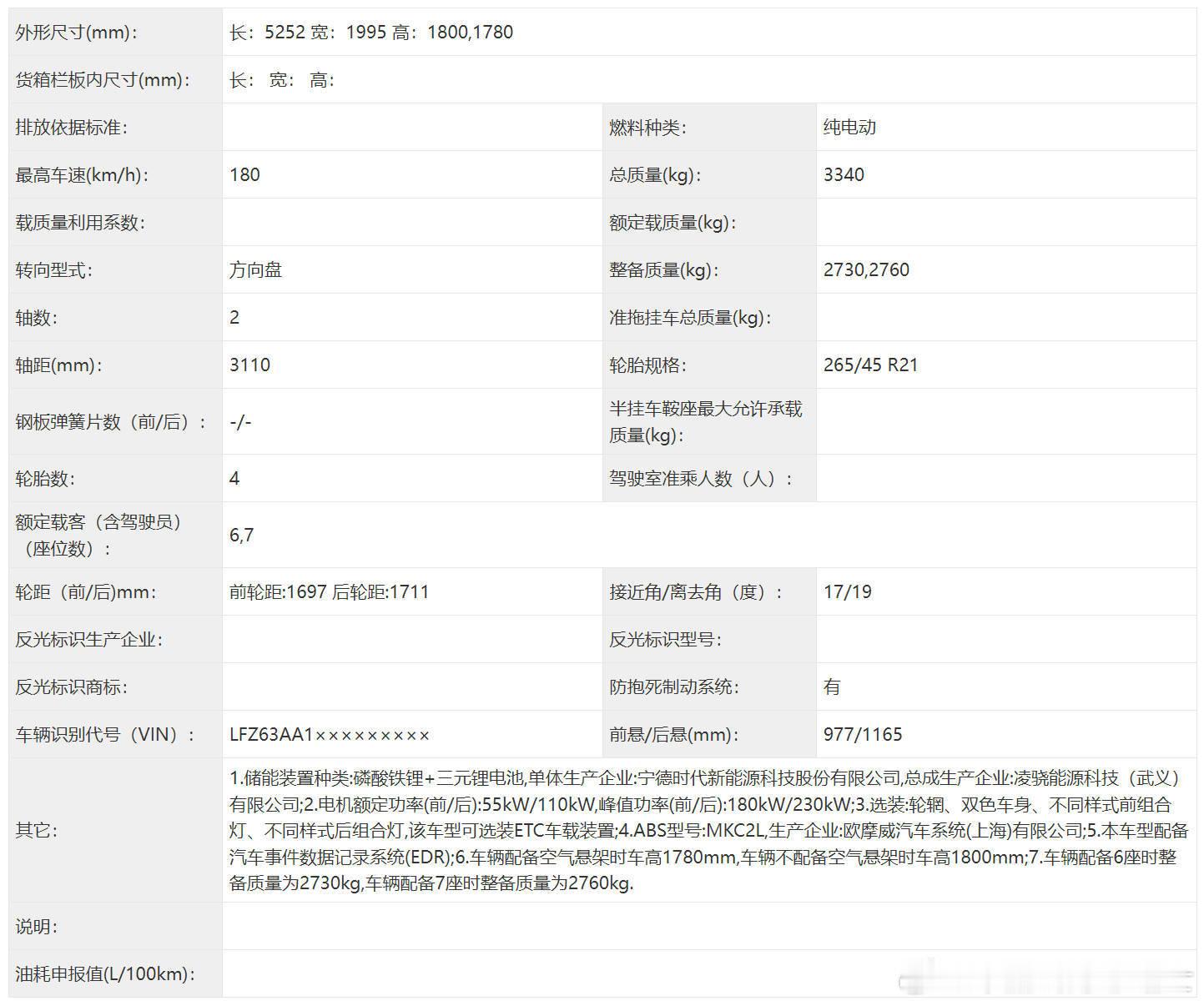 零跑D19工信部申报信息曝光,增程/纯电双版本齐发!零跑汽车旗下全新全尺寸SUV车型D19近日在工信部完成申报,这款旗舰级SUV将推出增程式和纯电动两种动力版本,标志着零跑正式进军大型SUV市场。从车身尺寸来看,零跑D19的表现相当惊艳,长宽高分别为5252/1995/1800(1780)毫米,轴距更是达到了3110毫米,这样的尺寸在全尺寸SUV领域极具竞争力。新车提供6座和7座两种座椅布局,宽敞的空间足以满足大家庭或商务出行需求。车辆可选装空气悬架,配备后车身高度为1780毫米,未配备则为1800毫米。动力系统是零跑D19的核心看点。增程版本采用前后双电机布局,电机额定功率分别为66千瓦和88千瓦,峰值功率达到100千瓦和200千瓦,搭配最大净功率95千瓦的增程器,能够完美平衡性能与续航。纯电版本则拥有更强悍的动力输出,前后电机峰值功率分别高达180千瓦和230千瓦,为这台大块头提供充沛的动力储备。电池方面,两个版本均采用宁德时代的电池方案,增程版使用磷酸铁锂电池,纯电版则搭载磷酸铁锂与三元锂的混合电池包。整车最高车速可达180公里/小时,根据座位配置不同,整备质量在2730至2770公斤之间。配置层面,新车标配防抱死系统、行车记录系统等安全装备,同时支持选装多样式轮毂、双色车身、不同造型的灯组以及ETC设备,满足用户的个性化需求。我的零跑生活