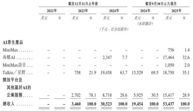 MiniMax在2025年前9个月来自Talkie╱星野收入为1875万美元,占比35.1%;来自开放平台及其他基于AI的企业服务收入1542万美元,占比为28.9%。