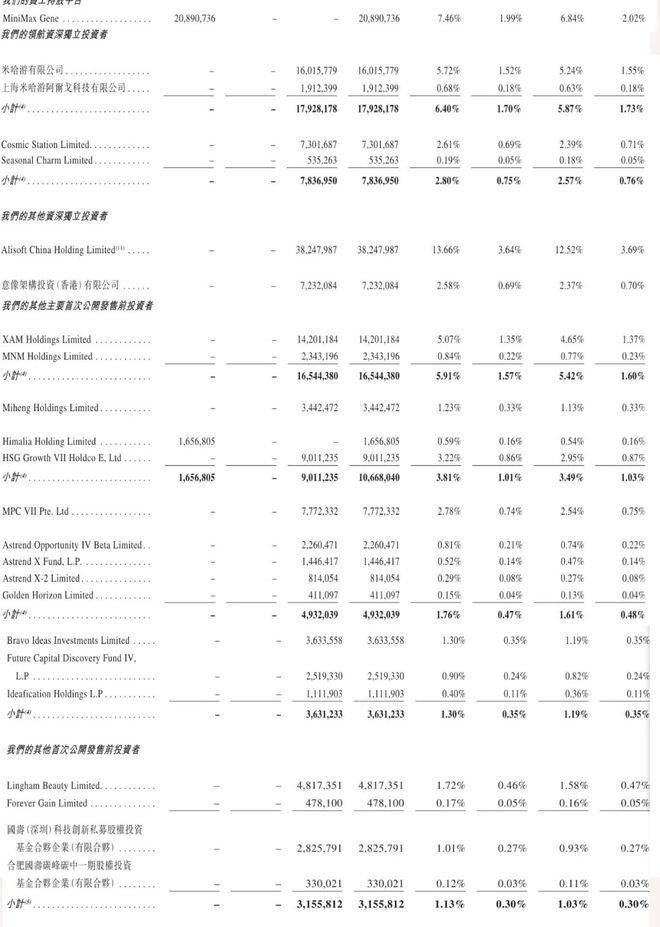 MihengHoldings持股为1.13%,有0.33%投票权;HimaliaHolding持股为0.54%,有0.16%的投票权;HSGGrowthVII持股为2.95%,有0.87%的投票权,一共持股为3.49%,有1.03%的投票权。MPCVII持股为2.54%,投票权为0.75%。