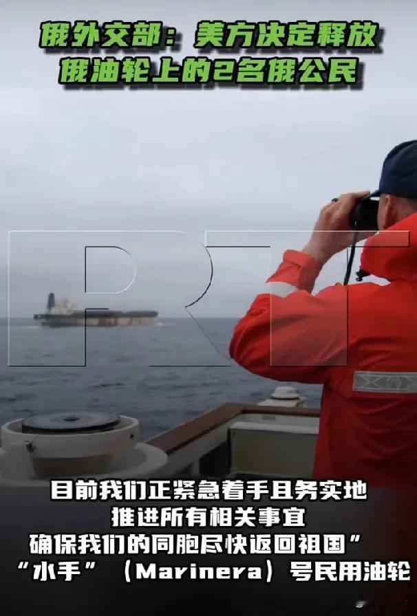 美国释放“水手”号上的俄罗斯公民。 据《今日俄罗斯》报道,1月9日,俄罗斯外交部发言人扎哈罗娃表示,在俄罗斯外交部提出交涉后,美国总统特朗普已决定释放“水手”(Marinera)号油轮上的两名俄罗斯公民。 扎哈罗娃说:“我们对这一决定表示欢迎,并向美国领导层表示感谢。目前我们正紧急着手且务实地推进所有相关事宜,确保我们的同胞尽快返回祖国。” “水手”(Marinera)号民用油轮悬挂俄罗斯国旗航行,船上共有2名俄罗斯公民、17名乌克兰公民、6名格鲁吉亚公民以及3名印度公民。 据媒体报道,1月8日,俄罗斯外交部就悬挂俄罗斯国旗的民用油轮“水手”(Marinera)号遭武力劫持发表声明。俄外交部强调,在公海拦截和检查船舶只能基于海盗行为或贩卖奴隶等理由,而这些理由不适用于“水手”号。 中国外交部发言人毛宁8日在例行记者会上对此回应表示,美方在公海海域随意扣押他国船只严重违反国际法。中方一贯反对缺乏国际法依据、未经联合国安理会授权的非法单边制裁,反对任何违反《联合国宪章》宗旨和原则、侵犯别国主权安全的行径。