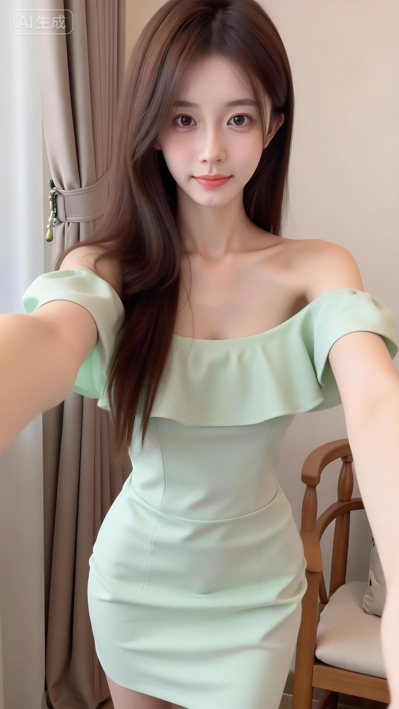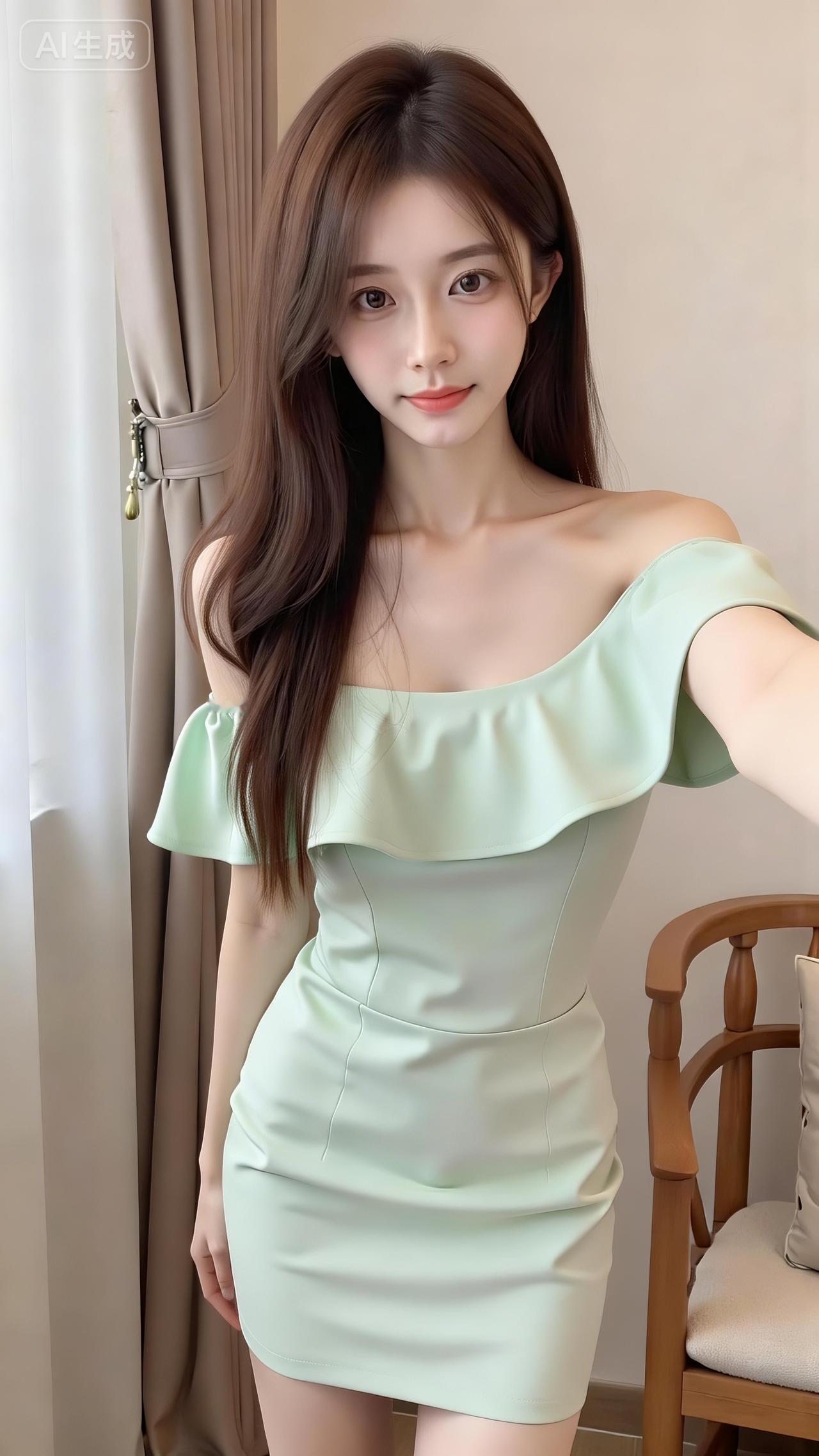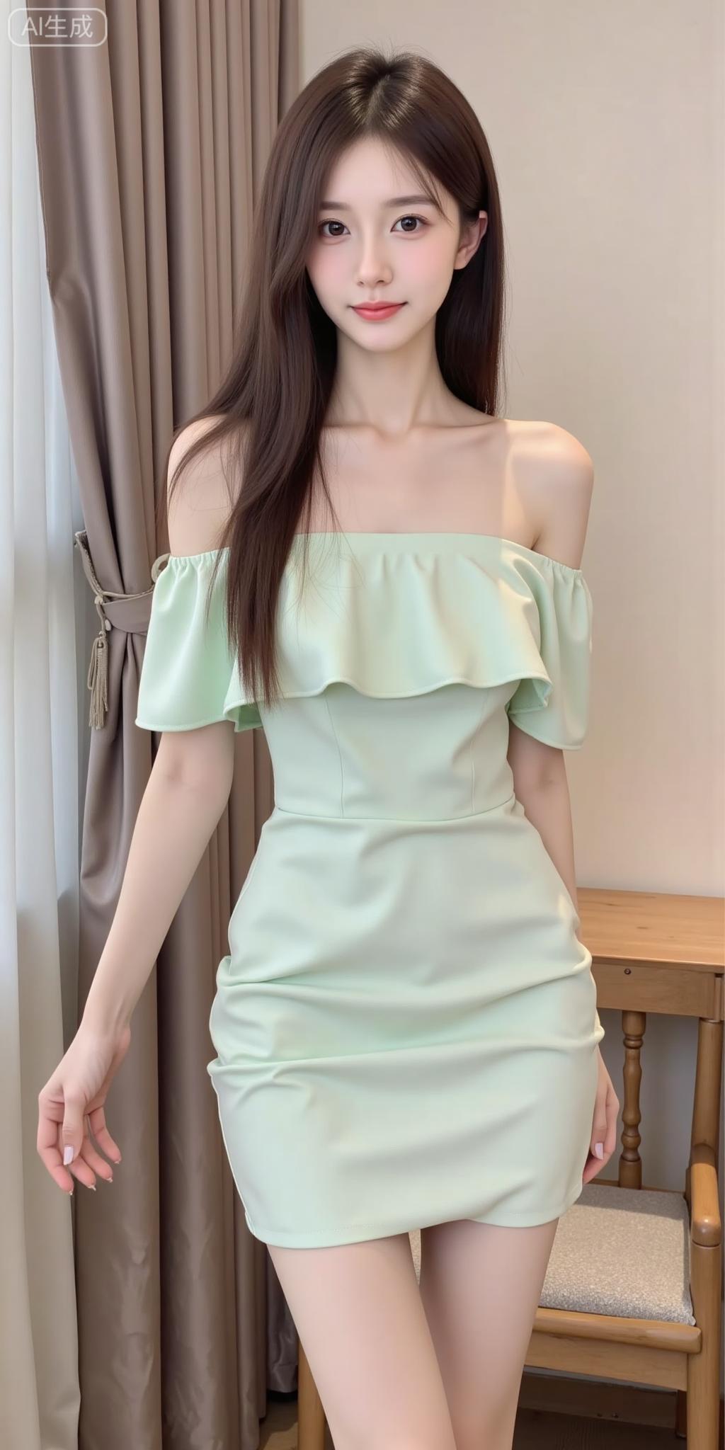薄荷绿裙的温柔暴击 一字肩+荷叶边也太戳审美了!薄荷绿衬得皮肤又白又透,收腰设计刚好勾出轻盈曲线✨ 长发垂肩自带柔雾感,是把“清冷甜”焊在身上的美少女~薄荷奶绿吊带裙
