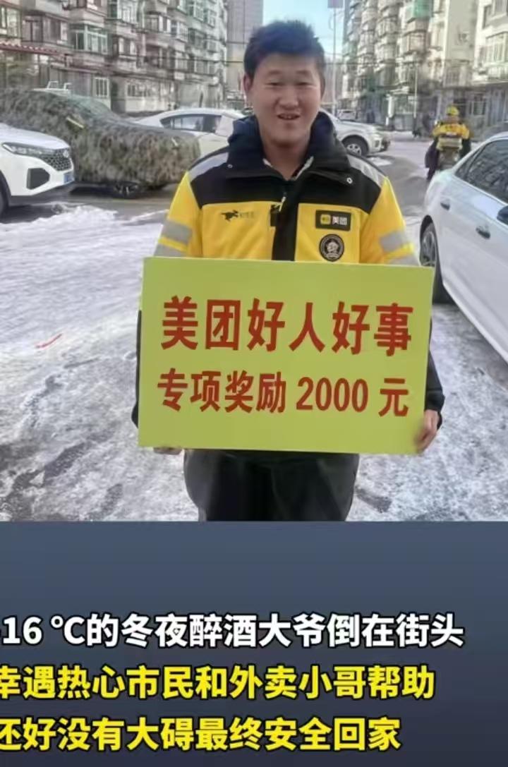 冰冷的夜晚,他守护人间的温暖,照亮了一座冰城! 2025年12月26日的夜晚,辽宁省抚顺市东洲区的街头,天寒地冻。 街上的行人寥寥无几。可是偏偏还有一位醉酒的大爷,一动不动地躺倒在冰冷的马路旁。让个看了就心寒。 这可是零下16度啊 !这是一个多么危险和冰冷的夜晚!如果就这么躺在这里,大爷肯定会出现意外! 就在这危险的时刻,一位穿着美团外卖制服的小哥李春雷,路过这里,看到了躺在地上的大爷。 他,二话不说,就立马下车,伸出了援手,开始对大爷进行施救。 与此同时,一位开车路过此地的大哥也发现了这一情况,就把车停了下来,加入到救助的行列。 后来,巡逻的民警就赶到了,认出这是住在附近的居民,安全地把老人送回了家。 值得称赞的是美团平台的迅速反应。他们授予李春雷“先锋骑手”称号并给予好人好事奖金。 对李春雷来说,这不仅仅是一份奖励,更是一个清晰的信号:平台珍视并积极培育骑手身上的优良品格。 我们感谢李春雷这样的骑手。他用行动守护着城市的温度,温暖了一座城。 同时,我们也认可美团这样的平台,用机制守护着每一份可贵的善意。这是企业社会责任最生动的体现,也让我们的生活环境更加安心、美好。