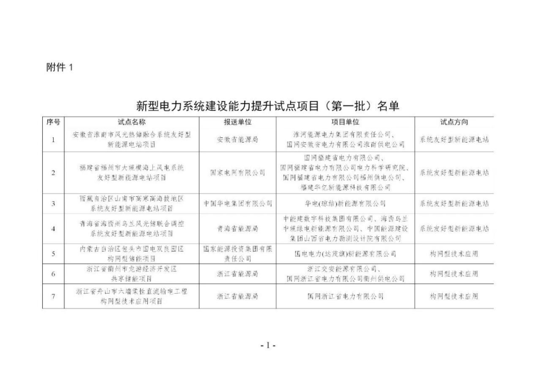 1.新型电力系统建设能力提升试点项目(第一批)名单
