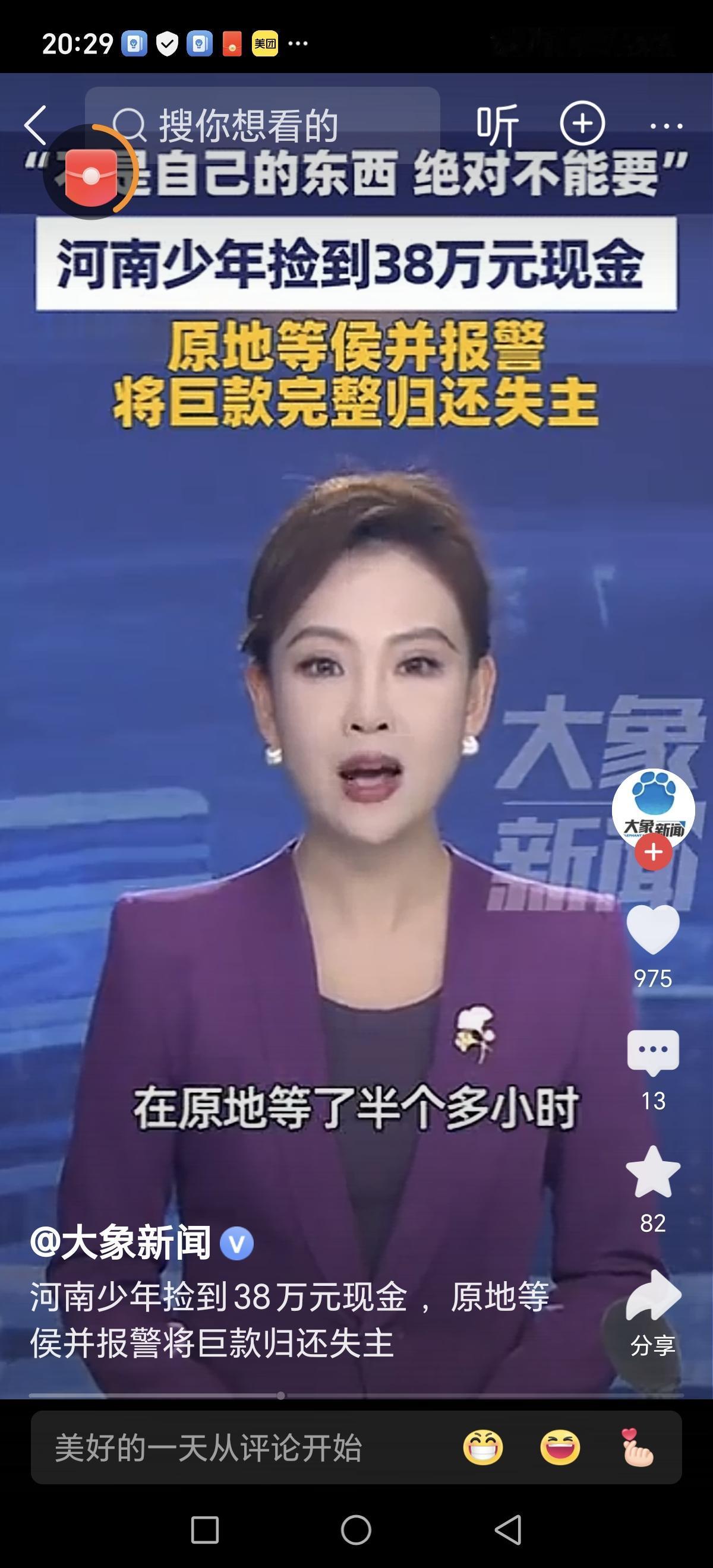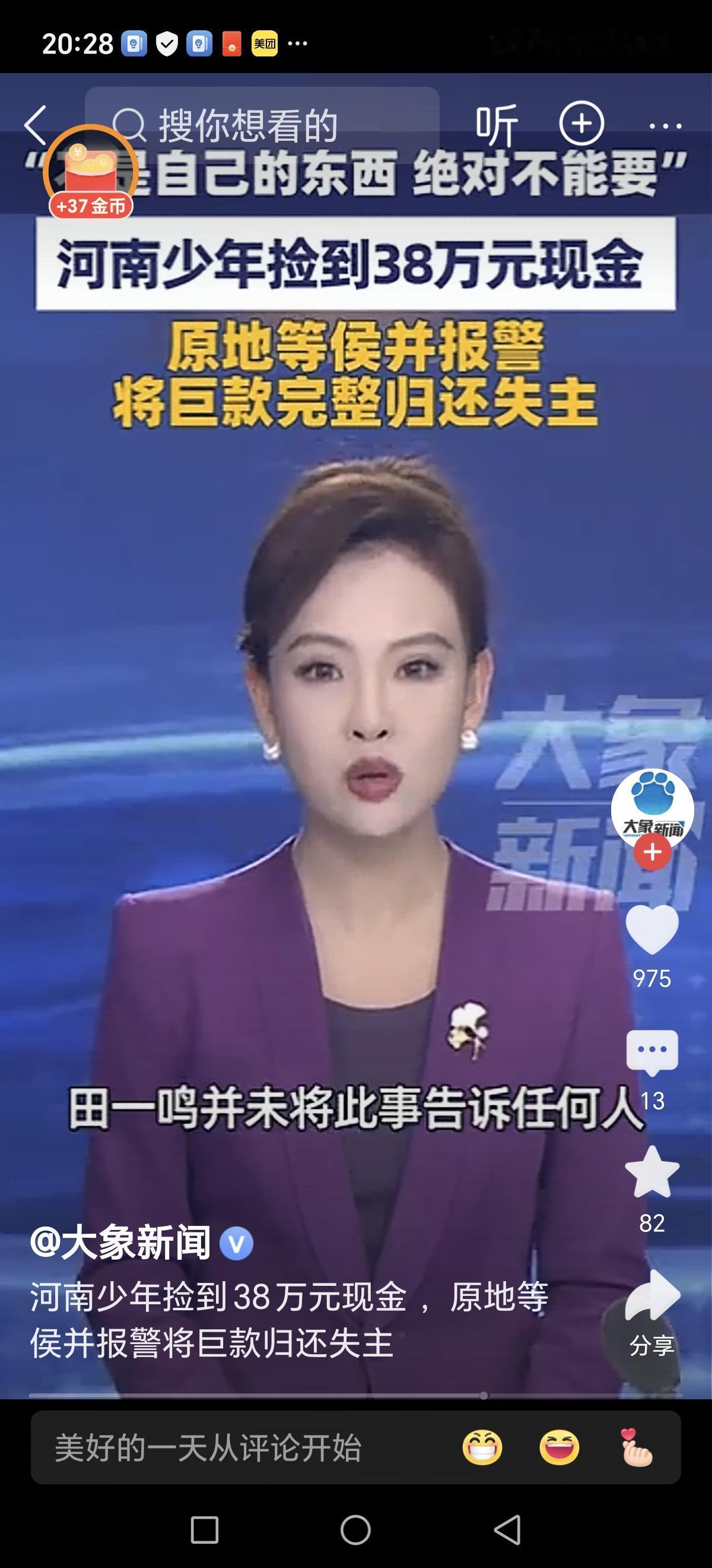 这则关于郑州一名高三少年在公园捡到38万元巨款,并选择坚守诚信、主动报警的新闻,