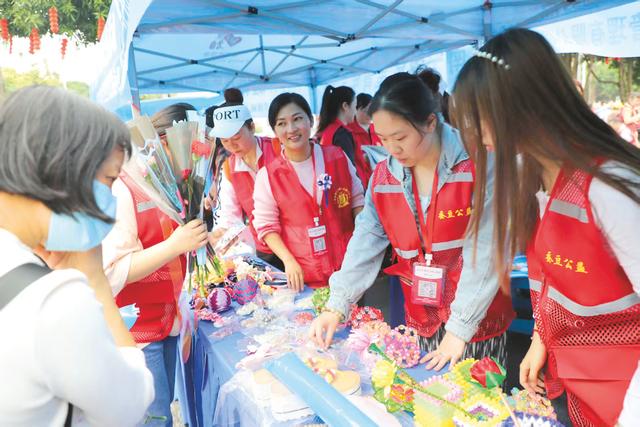 志愿者积极参与“蚕豆公益”活动,现场进行残疾人手工艺品爱心义卖。(市残联供图)