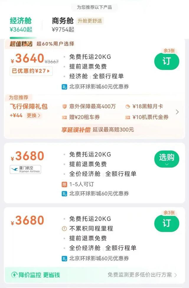 记者在另一购票平台查询了一趟从海南三亚到北京的机票,排名第一的选项价格为3640元,“订票”按钮的设置与价格平行,在一条分隔线下方写着“为您推荐飞行保障礼包”,看起来这是一个需要额外点击才会购买的独立选项,但实际上这也是一个捆绑销售的套餐产品。