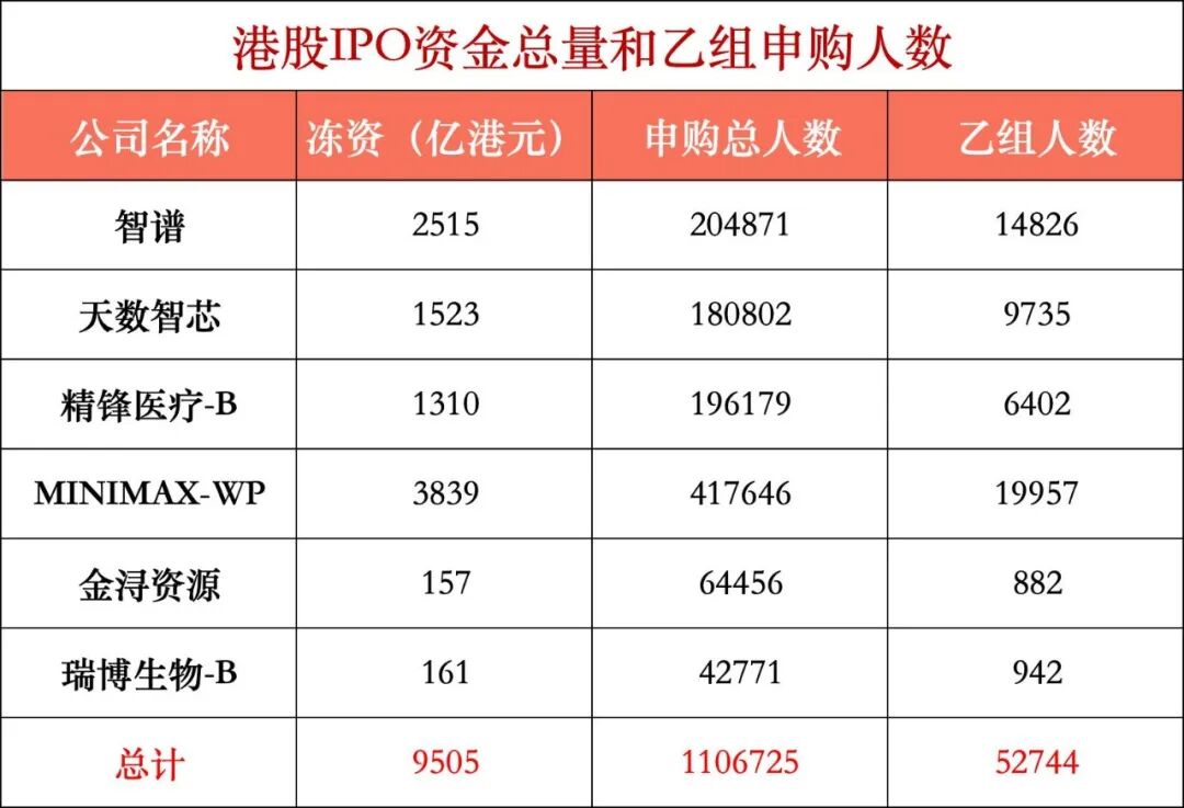 此次6只新股的乙组中签率与估算值差距很大,主要原因在于我参考的是历史数据,港股打新市场约有6000亿资金,具备实力申购乙组的打新人约3万人,基于这一人数模型进行估算。然而,新股分配数据公布后,经计算发现打新资金在短时间内激增至9505亿港元,乙组申购人数也达到52000多人,远超先前统计数据,总申购人数相比此前也翻倍增长。