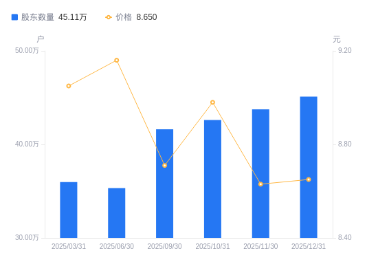 日期A股户数(户)流通A股户均持股数(股)户均持股市值(万元)2025-12-3145110041860.5336.212025-11-3043745743166.0437.252025-10-3142601644325.2939.802025-09-3041626345363.8339.512025-06-3035336953437.8648.952025-03-3135982252479.5247.492024-12-3132232958583.8860.172024-09-3032052558913.6164.632024-06-3028809365545.8067.412024-03-3129096264899.4957.21