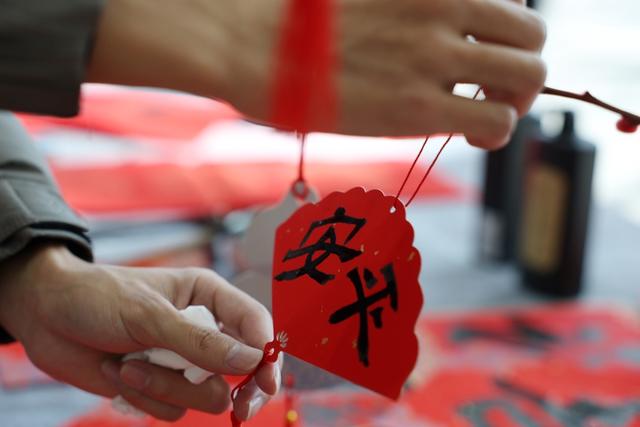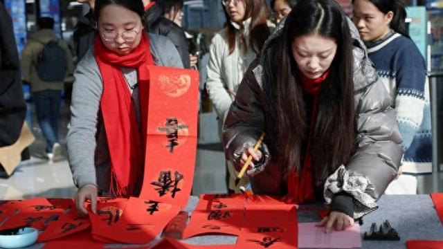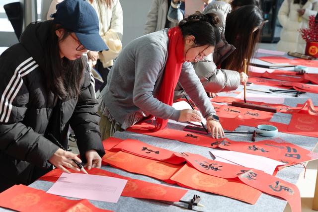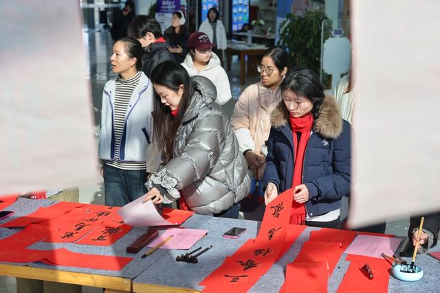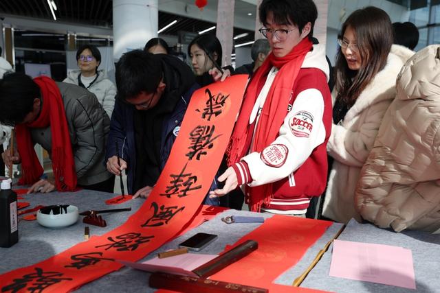来自美术学院书法专业的研究生也现场挥毫,为全校师生书写春联与“福”字,迎新春送祝福。师生们或排队请书法专业师生题字,或亲自挥毫一试身手。不少国际学生也拿着自己手写的“福”字用中文说着“新年快乐”。