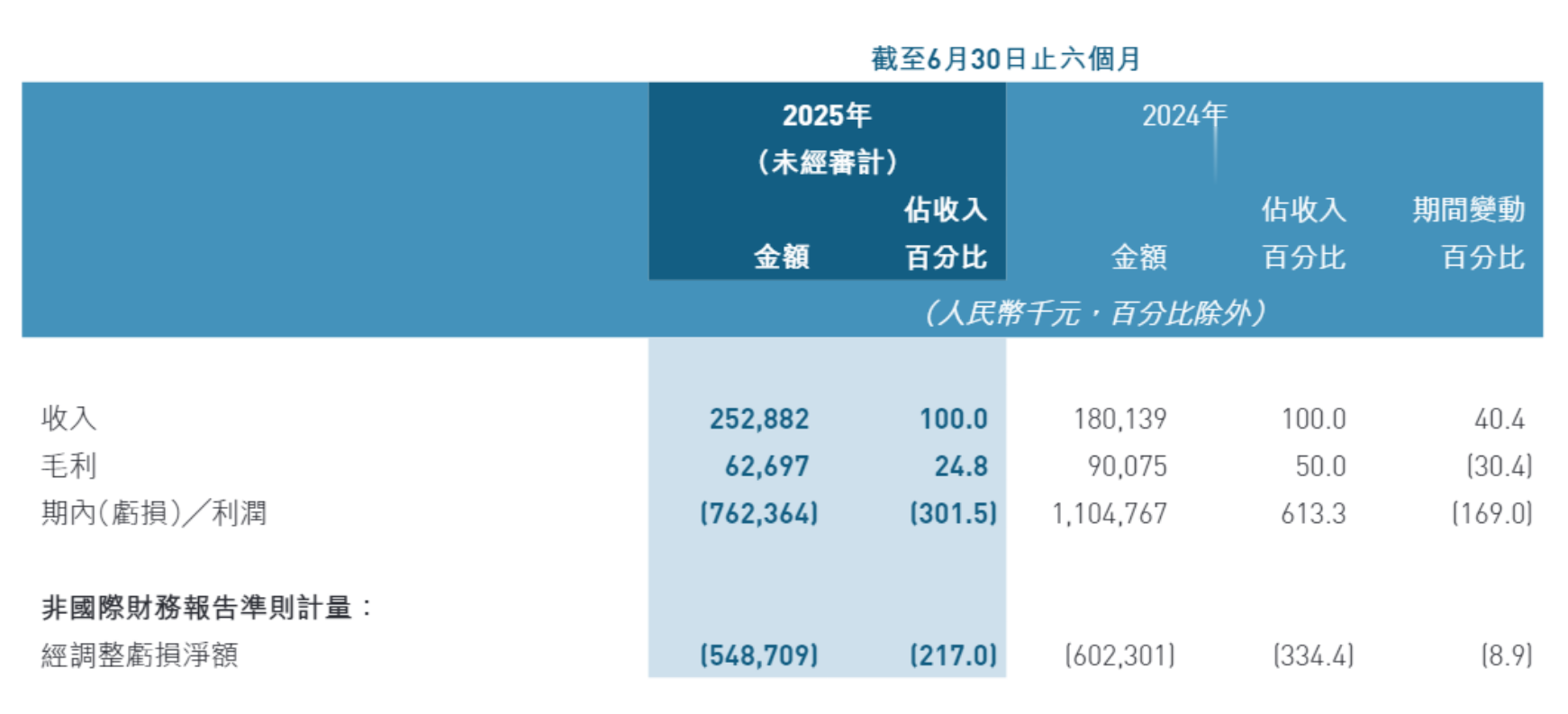 2025年中报显示,黑芝麻智能营业收入同比增长40.4%,达到2.53亿元。但其净利润由盈转亏,从2024年同期的盈利11.05亿元,降为亏7.62亿元;毛利率则由2024年同期的50.0%降至2025年中的24.8%。