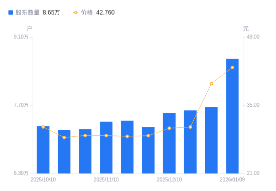 日期A股户数(户)流通A股户均持股数(股)户均持股市值(万元)2026-01-09865119494.9140.602025-12-317664910716.5742.292025-12-197595010815.2033.022025-12-107544110888.1732.982025-11-287254911322.2032.552025-11-207382711126.2031.842025-11-107363311155.5232.112025-10-317210011392.7132.802025-10-207195611415.5132.402025-10-107274011292.4734.50