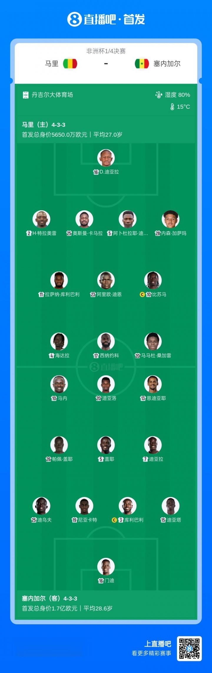 直播吧01月09日讯北京时间1月10日0:00,非洲杯1/4决赛,马里vs塞内加尔。赛前双方公布了本场比赛的首发名单。
