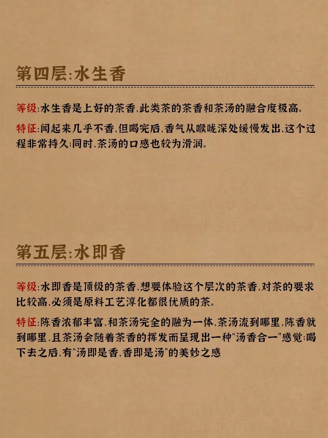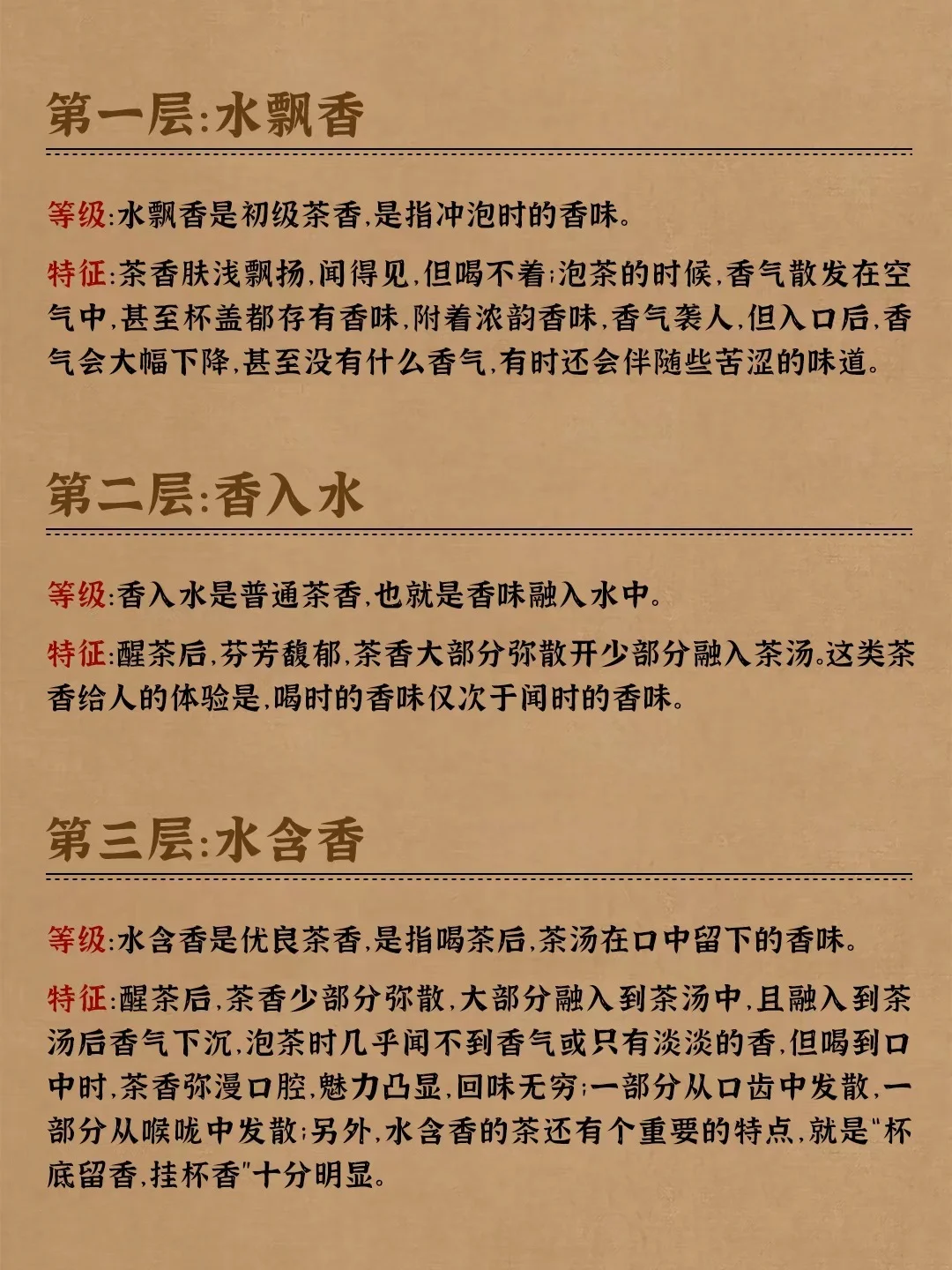 第一层:水飘香 等级:水飘香是初级茶香,是指冲泡时的香味。 第二层:香入水 等级:香入水是普通茶香,也就是香味融入水中。 第三层:水含香 等级:水含香是优良茶香,是指喝茶后,茶汤在口中留下的香味。 第四层:水生香 等级:水生香是上好的茶香,此类茶的茶香和茶汤的融合度极高。 第五层:水即香 等级:水即香是顶级的茶香,想要体验这个层次的茶香,对茶的要求比较高,必须是原料工艺淳化都很优质的茶。