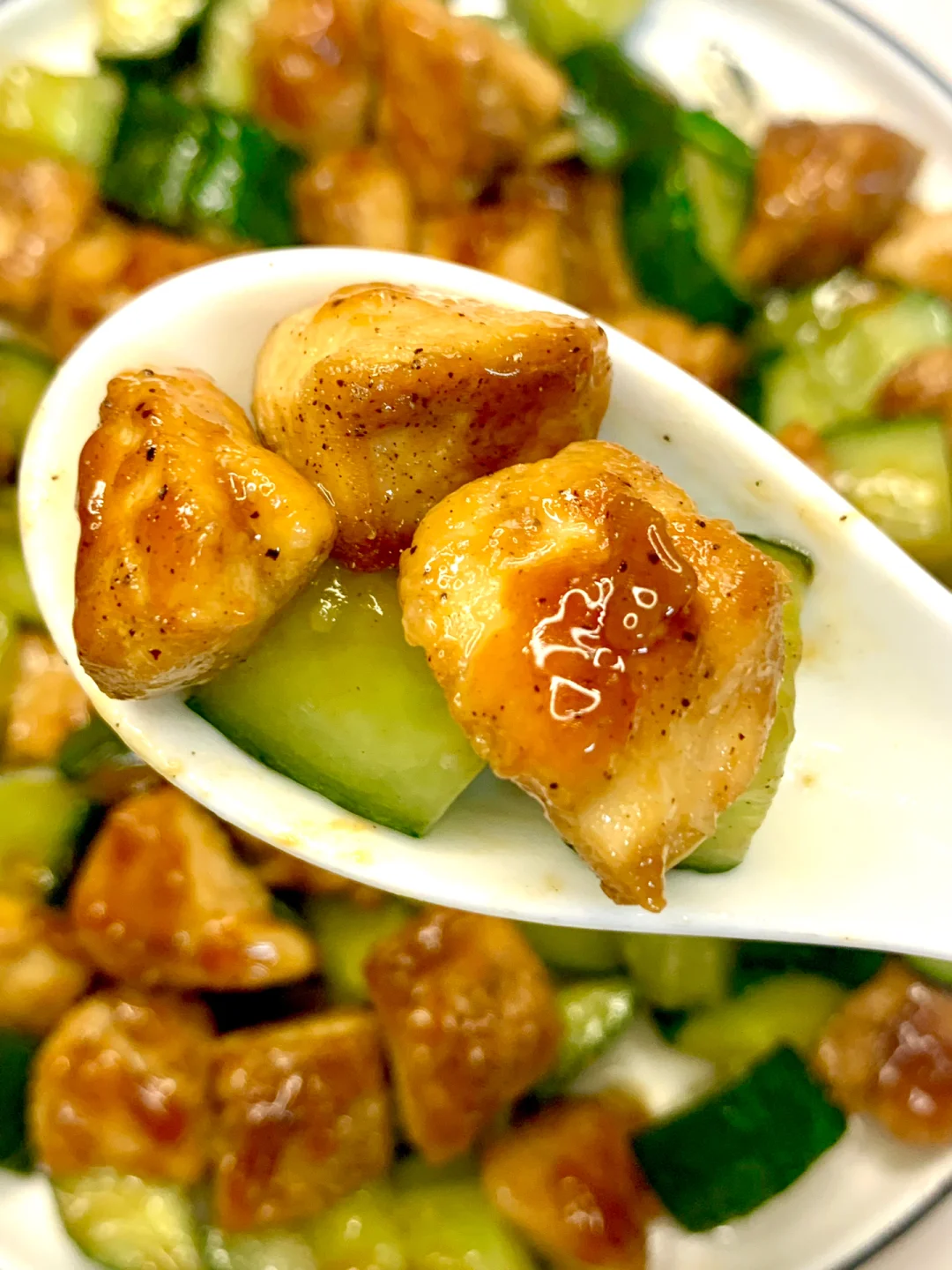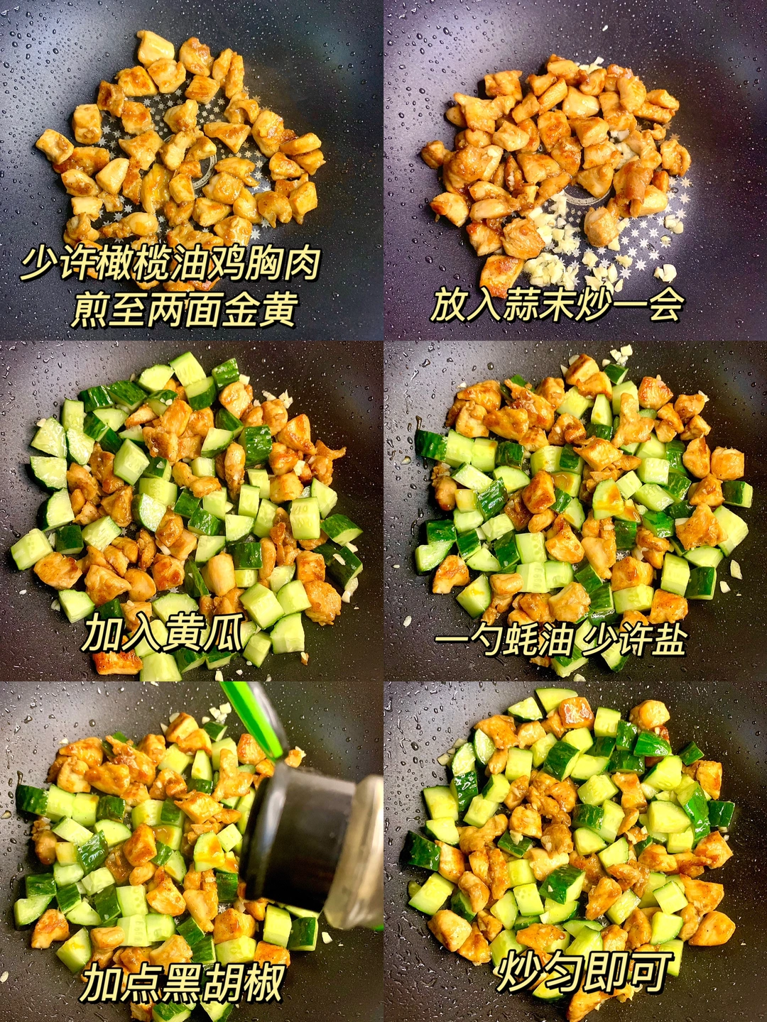 [赞R]今日分享这份~黄瓜炒鸡胸肉,鲜美可口,太好吃了!低卡高蛋白,好吃不胖~做法间单,快学做起来吧~ [彩虹R]食材:黄瓜 鸡胸肉 [种草R]做法:如图所示~