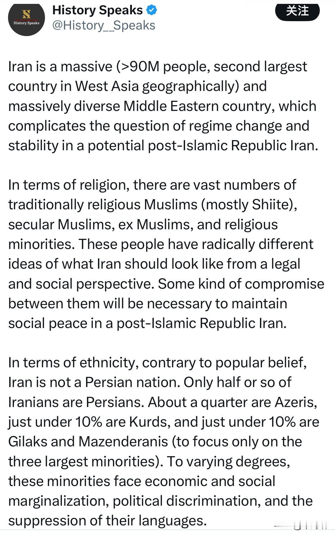 伊朗是一个幅员辽阔(人口超过 9000 万,是西亚地理面积第二大的国家)且文化极其多元化的中东国家,这使得在潜在的后伊斯兰共和国时期,伊朗的政权更迭和稳定问题变得更加复杂。 在宗教方面,伊朗存在着数量庞大的传统穆斯林(主要是什叶派)、世俗穆斯林、前穆斯林以及宗教少数群体。这些人对于伊朗在法律和社会层面上的未来发展有着截然不同的理念。为了在后伊斯兰共和国时代的伊朗维护社会和平,他们之间必须达成某种妥协。 就民族构成而言,与普遍认知相反,伊朗并非波斯民族国家。伊朗人口中只有大约一半是波斯人。约四分之一是阿塞拜疆人,近10%是库尔德人,吉拉克人和马赞德拉尼人也分别占近10%(仅列举这三大少数民族)。这些少数民族在不同程度上面临着经济和社会边缘化、政治歧视以及语言压制。