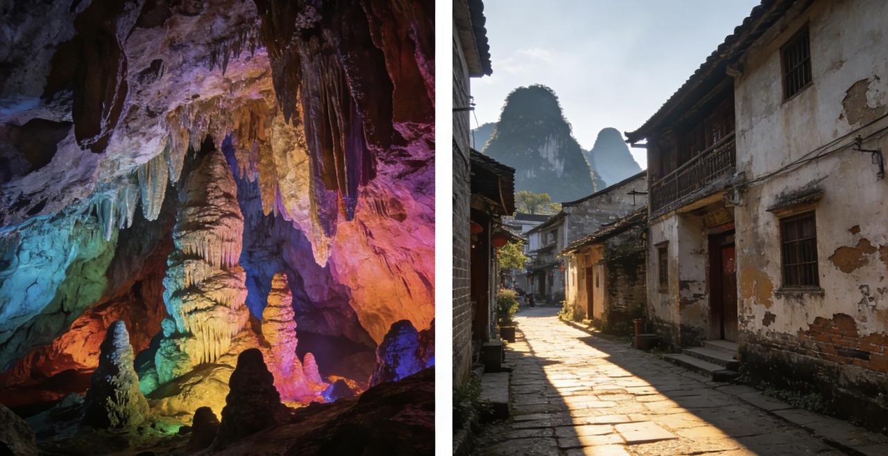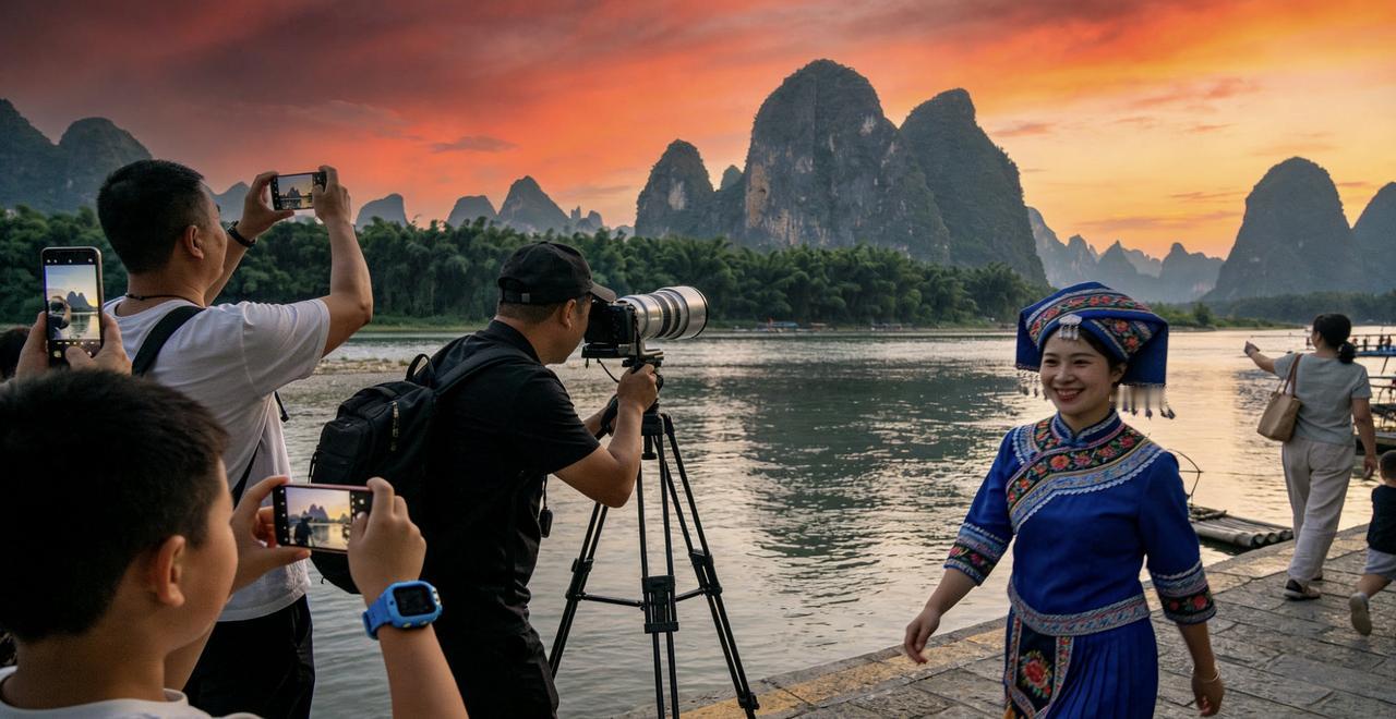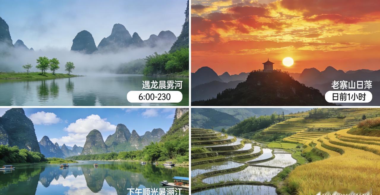 在桂林,摄影像呼吸一样简单 按快门的瞬间,我突然明白——在桂林,出片真的像呼吸一样自然。 清晨六点的遇龙河,竹筏划破镜面般的水,船夫一声吆喝在山谷间回荡。我甚至没调整参数,随手一拍:晨雾、远山、倒影,妥妥的山水画。旁边穿汉服的姑娘笑着展示手机:“看,张张都是壁纸!” 摄影老手们总说“黄金一小时”,在桂林,这话得改改。正午阳光太烈?躲进银子岩,洞内灯光把钟乳石照得梦幻,手机夜拍模式直出大片。下午三四点,兴坪古镇老屋斑驳,阳光斜照在青石板上的光影,故事感拉满。 登上老寨山,一对白发夫妇让我帮忙合影。老爷子说,三十年前他们在这里拍婚纱照,现在再来,山水依旧。“有些地方,”他停顿,“怎么拍都不会错。” 摄影在这里回归本能——不是追逐参数,而是感受。遇龙河漂流,水花溅上镜头反倒添了灵动;龙脊梯田,老太太插秧的身影融入千层绿浪;哪怕街头一碗桂林米粉,热气腾腾都是生活气息。 傍晚的漓江边,专业摄影师架起三脚架,游客举着手机,孩子用儿童手表——每个人都以自己的方式记录这片山水。穿壮服的阿妹经过,笑着说:“我们天天看,还是觉得像画。” 当风景足够慷慨,摄影便不再是技术,而是一种本能反应。在桂林,你需要的不是多么昂贵的设备,而是愿意抬起眼睛,按下快门的那个瞬间。 因为在这里,美从不躲藏。它就在每个转角,每次抬头,每阵带着竹香的风里,等待被你看见,成为记忆里的一帧永恒。 下次来桂林,别只想着“要拍什么”。试着让这片山水告诉你,它想被怎样记住。你的镜头,不过是替这千里江山,完成一次早已注定的相遇。 【桂林拍摄小贴士】 1. 遇龙河晨雾在6:00-7:30最美 2. 老寨山日落前1小时登山最佳 3. 漓江倒影拍摄可选下午顺光时段 4. 龙脊梯田灌水期(5-6月)和稻黄期(9-10月) 你在桂林拍过最惊艳的照片是什么?评论区晒出来吧!