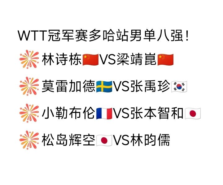 男单八强都有谁? 2026WTT冠军赛多哈站男单八强已经决出, 国乒选手占据两席,但接下来两人就是内战,期待林诗栋🇨🇳、梁靖崑🇨🇳不要消耗太多。 日本队也占据了两席,张本智和对阵小勒布伦🇫🇷是今晚的焦点之战。小布加油! 昨晚松岛辉空🇯🇵3-0战胜队友宇田幸矢🇯🇵晋级八强,总是凌晨比赛的松岛辉空悄无声息地来到八强席位,看见他的名字,还是感觉到了一阵寒气。 那好松岛,如果小布无法击败张本,你就把张本击败吧。 (感谢草莓老师的图片)