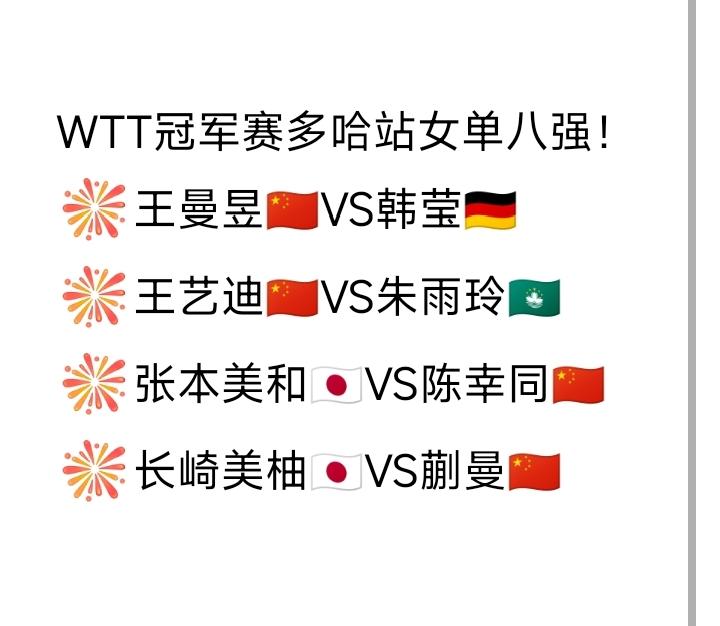女单八强都有谁? 2026WTT冠军赛多哈站女单八强如下图。 国乒女队共有五名大将参赛,但今日凌晨,曾经输过韩莹的陈熠又被让二追三,惨遭淘汰,剩下四员大将分据四个1/4区,没有内战,也让人稍稍有点儿安慰。 看看对手名字,曼昱和大迪都让人很放心,但同同迎战张本美和🇯🇵、蒯曼🇨🇳 迎战长崎美柚,还是微微有一丝棘手。 蒯曼、同同加油[奋斗]! (感谢草莓老师的图片)