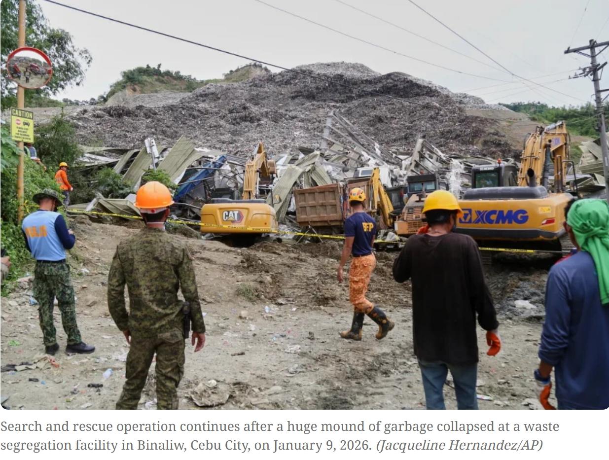 菲律宾垃圾处理厂垃圾堆坍塌,造成至少1人死亡数十人失踪 当地时间周五,菲律宾中部宿务市比纳利乌村一处废弃物分类设施发生的垃圾坍塌掩埋了工人,造成一人死亡,七人受伤,至少27人失踪。 当地警方称,救援人员救出了八名幸存者,并正在搜寻仍在被困的失踪者,其中一名被救者是一名女性垃圾填埋场工人,她在送医途中去世。 然而宿务市长内斯特·阿库瓦尔表示,至少有12人获救,另有38人失踪。警方和档案部门给出的失踪和获救人数不同的原因尚不清楚。
