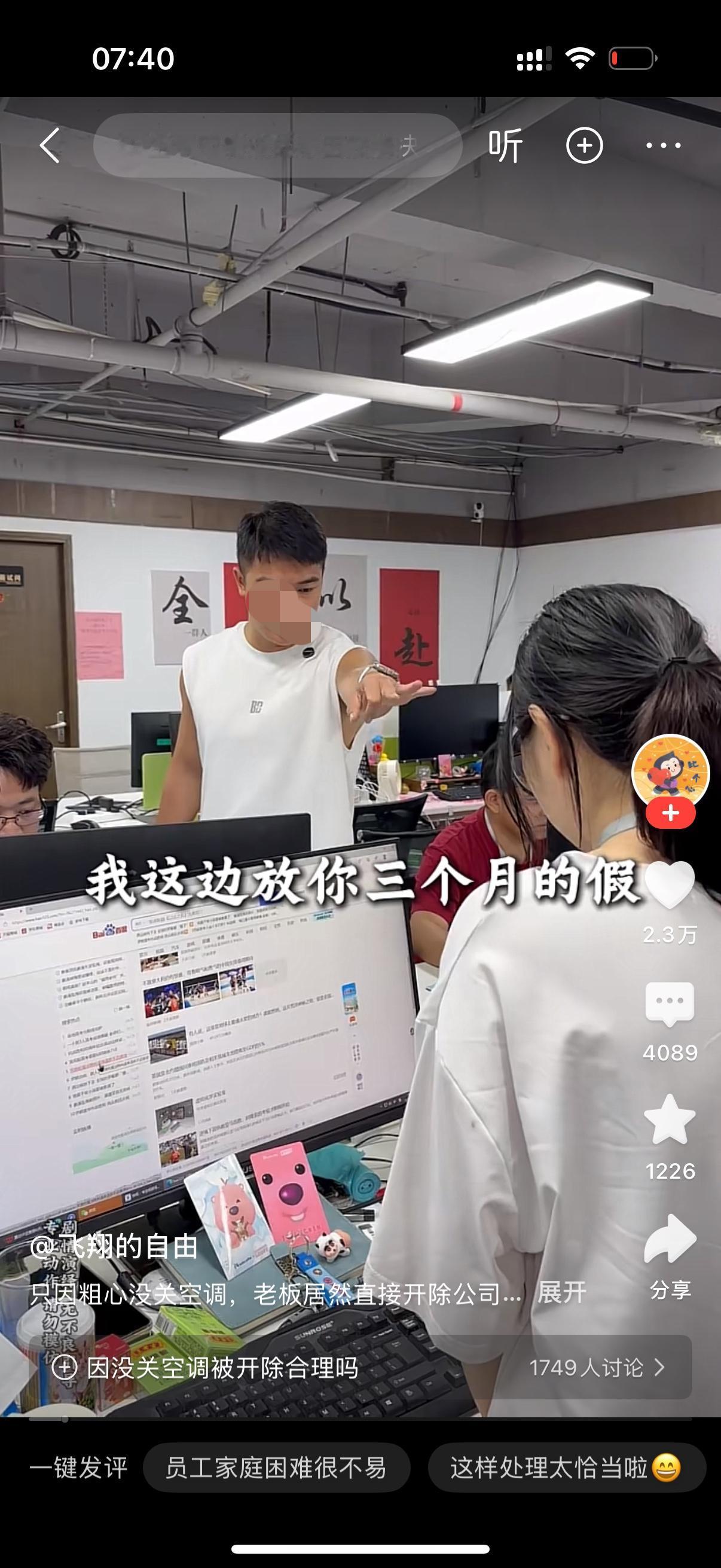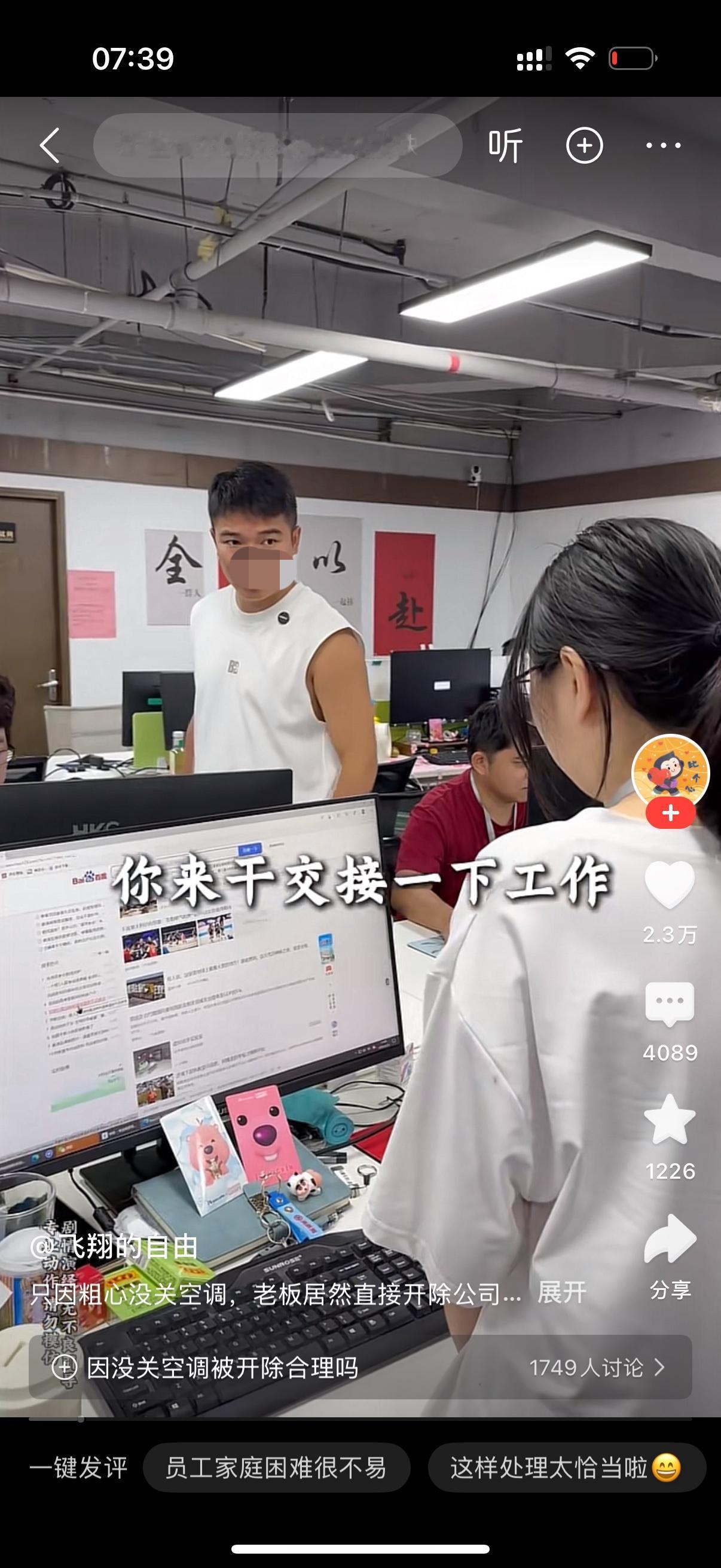 老板气冲冲地跑过来大喊,昨天下班谁是最后一个走的?女孩颤颤巍巍站起来说是我。老板对她怒吼,为什么不关空调?女孩怯生生说,昨天加班比较晚,所以…。老板说,加太晚是理由吗?女孩说,我错了,以后不会了。老板不留情面说,没有以后了,你交接下工作吧。女孩泪崩,因为没有关空调丢掉了工作。