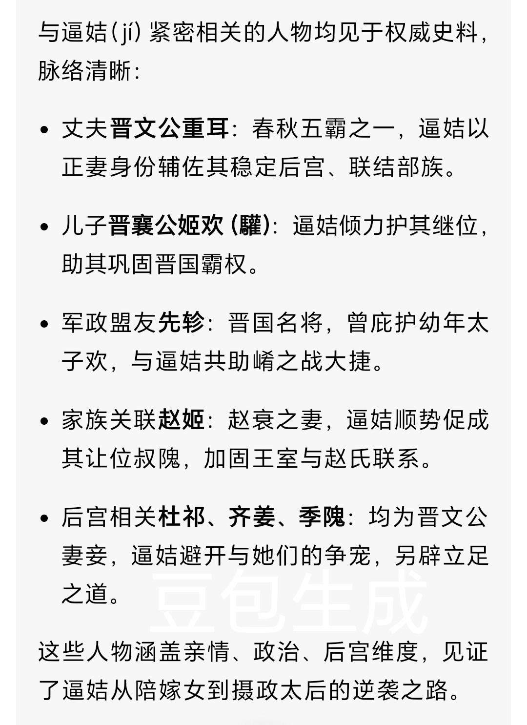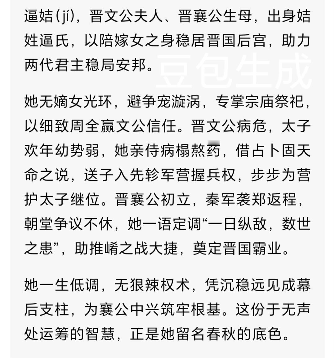 宫斗幸存者逼姞(jí):从陪嫁女到晋国摄政太后 公元前627年,晋国宫殿的青铜灯盏彻夜未明。刚继位的晋襄公披着麻衣守灵,而真正稳定朝局的,是帷帐后那位双眼通红却腰背挺直的女人——他的母亲逼姞(jí)。史书对她的记载仅寥寥数笔,只称其为晋文公夫人、襄公之母,却藏着一位陪嫁女步步逆袭的传奇人生。 一 她不是秦室宗女,而是联结部族的关键棋子 公元前636年,重耳结束十九年流亡生涯,借秦国之力归国夺位。秦穆公为巩固联盟,送五名秦国宗女嫁与重耳,而逼姞(jí)并不在这支队伍之中。她出身姞(jí)姓逼氏,姞姓是黄帝后裔十二大姓之一,身后是实力雄厚的东方部族。 彼时晋国初定,亟需拉拢各方势力稳固根基。重耳与逼姞(jí)的联姻,本就是一场瞄准部族支持的政治布局。她没有秦女的光环加持,却凭借母族的影响力,成了晋国君臣眼中不可忽视的存在。 二 深宫里的生存智慧:不争宠,只抓实权 晋文公的后宫堪称春秋时期的权力角斗场,正妻杜祁(狄族公主)、宠妾齐姜(齐国宗女)、季隗(wěi,狄族女子),个个背景不凡。 逼姞(jí)没有卷入争宠漩涡,反而将目光投向了旁人不愿接手的宗庙事务。在春秋礼制中,祭祀是国之大事,主持祭祀不仅能贴近国君,更能借此掌握与宗室、朝臣沟通的渠道。她凭借严谨细致的行事风格,将宗庙祭祀打理得井井有条,既避开了后宫纷争,又悄然积攒了旁人难以企及的政治资本。 三 押注幼主:三步棋稳住太子之位 公元前628年,晋文公病危,朝堂暗流汹涌。太子欢尚且年幼,而几位庶出公子早已成年,且各有党羽支持,太子之位岌岌可危。逼姞(jí)沉着应对,走出三步关键棋: 一是亲自侍奉病榻,煎汤熬药、打理衣食,以贤德形象赢得文公与朝臣的认可; 二是借力占卜之言,以“幼主得天助”的说法,契合当时人们的天命观念,为太子名分增添合法性; 三是送太子欢前往大将先轸(zhěn)的军营历练,名义上是学习军事,实则是借助兵权为太子保驾护航。 后世史家评价,晋襄公能顺利继位,逼姞(jí)的谋划居功至伟。 四 摄政幕后:为晋国霸权奠定根基 晋襄公继位次年,秦国趁晋国国丧之际,派军偷袭郑国,未遂后率军返程,途经晋国崤(xiáo)山。年轻的晋襄公一时难决,朝堂之上争议不休:一派认为秦国曾助文公归国,此时攻打有违道义;另一派则以先轸(zhěn)为首,力主出兵阻击。 关键时刻,逼姞(jí)虽未直接临朝议政,却在后方稳定人心,明确支持先轸(zhěn)的战略主张。她深知,秦国东出之心已久,此次放过秦军,必成晋国数世之患。最终,晋军在崤(xiáo)山设伏,全歼秦军,俘虏三名主帅。这场崤(xiáo)之战,奠定了晋国百年霸权,而逼姞(jí)的远见卓识,为这场胜利筑牢了根基。 五 晚年智慧:顺水推舟织就权力网络 公元前622年,赵衰之妻赵姬主动提出,要迎回流亡在外的叔隗(wěi)母子,并让出正室之位,让叔隗(wěi)为正妻、其子赵盾为嫡子。 后世曾误读此事为逼姞(jí)欺压赵姬,实则不然。逼姞(jí)敏锐地察觉到赵姬此举的深意,顺势出面促成此事。既成全了赵姬的贤名,又让赵氏家族对王室心存感激,为晋襄公拉拢了这一重要的世家力量,织就了更稳固的权力网络。 逼姞(jí)的墓葬至今未被发现,但她的政治遗产清晰可见:辅佐晋国两代君主平稳过渡,开创襄公中兴的局面。她以陪嫁女的身份,一步步成为晋国权力枢纽,靠的从不是宫斗狠辣,而是精准的政治眼光与沉稳的行事智慧。 假如穿越回春秋,你是会选择当风光嫡女,还是做逼姞(jí)这样的潜力股?评论区聊聊你的生存策略! 关注我,下期揭秘楚国战俘如何逆袭成晋国六卿之首晋国风云人物 晋襄公之母