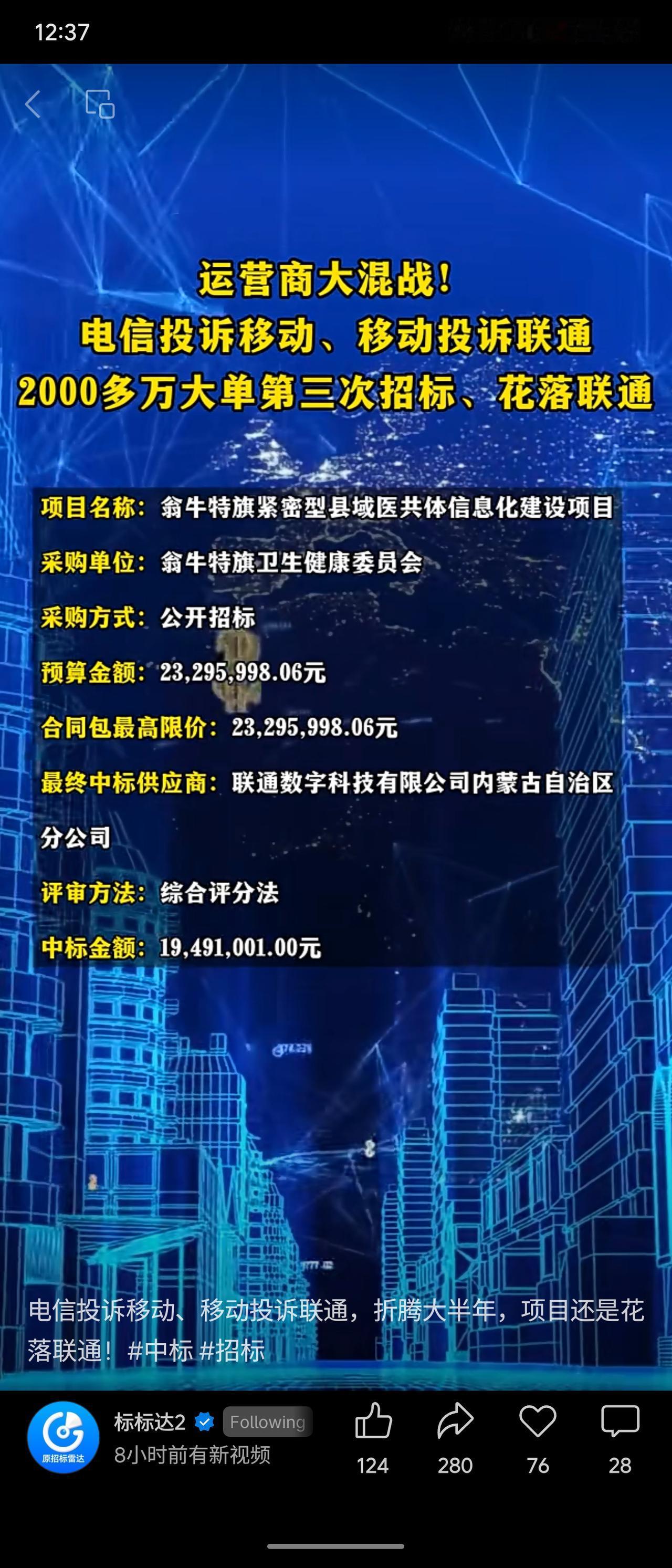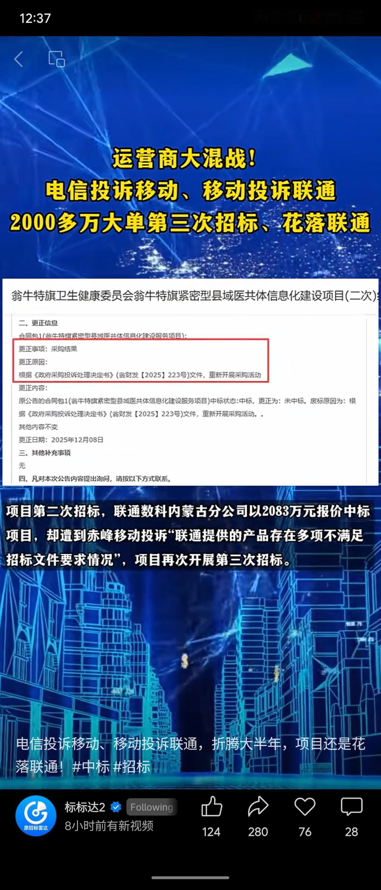 内蒙古翁牛特旗一个预算超2300万元的医共体信息化建设项目招标过程波折。首次招标移动中标后,被电信投诉而废标;二次招标联通中标后,又遭移动投诉再次废标。经第三次招标,最终由联通以约1949万元中标。此过程凸显了运营商在政企市场的激烈竞争。