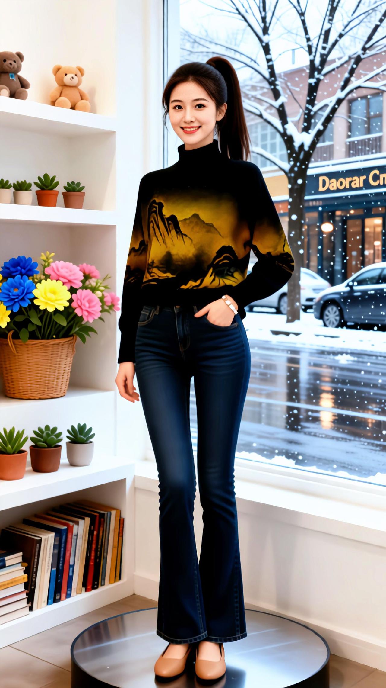 红衫暖韵映笑颜黑色背景如墨,一袭红色高领针织衫似撷取了冬日的暖阳,鲜活又热
