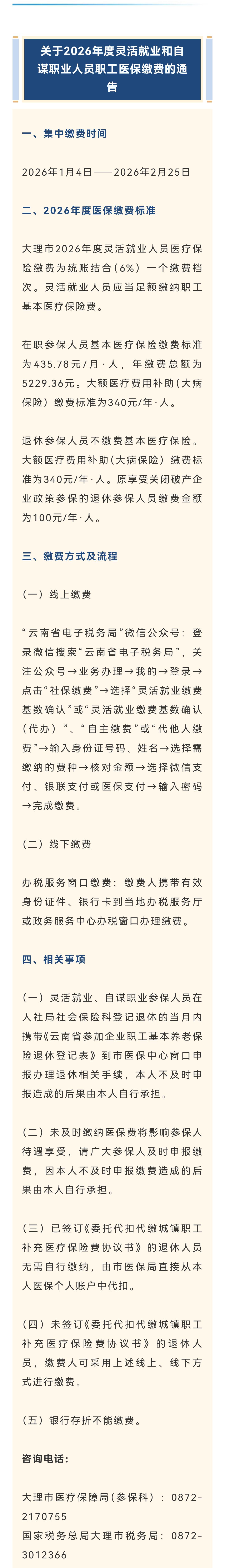 大理市关于2026年度灵活就业和自谋职业人员职工医保缴费的通告 一、集中缴费时间 2026年1月4日至2026年2月25日 二、2026年度医保缴费标准 大理市2026年度灵活就业人员医疗保险缴费仅设统账结合(6%)一个缴费档次。灵活就业人员需足额缴纳职工基本医疗保险费。 在职参保人员基本医疗保险缴费标准为435.78元/月·人,年缴费总额为5229.36元。大额医疗费用补助(大病保险)缴费标准为340元/年·人。 退休参保人员无需缴纳基本医疗保险。大额医疗费用补助(大病保险)缴费标准为340元/年·人。原享受关闭破产企业政策参保的退休参保人员缴费金额为100元/年·人。 三、缴费方式及流程 (一)线上缴费 “云南省电子税务局”微信公众号:登录微信搜索“云南省电子税务局”,关注公众号,依次点击业务办理→我的→登录,再点击“社保缴费”,选择“灵活就业缴费基数确认”或“灵活就业缴费基数确认(代办)”、“自主缴费”或“代他人缴费”,输入身份证号码、姓名,选择需缴纳的费种,核对金额,选择微信支付、银联支付或医保支付,输入密码,完成缴费。 (二)线下缴费 办税服务窗口缴费:缴费人携带有效身份证件、银行卡到当地办税服务厅或政务服务中心办税窗口办理缴费。 四、相关事项 (一)灵活就业、自谋职业参保人员在人社局社会保险科登记退休的当月内,携带《云南省参加企业职工基本养老保险退休登记表》到市医保中心窗口申报办理退休相关手续,本人不及时申报造成的后果自行承担。 (二)未及时缴纳医保费将影响参保人待遇享受,请广大参保人及时申报缴费,因本人不及时申报缴费造成的后果自行承担。 (三)已签订《委托代扣代缴城镇职工补充医疗保险费协议书》的退休人员无需自行缴纳,由市医保局直接从本人医保个人账户中代扣。 (四)未签订《委托代扣代缴城镇职工补充医疗保险费协议书》的退休人员,可采用上述线上、线下方式进行缴费。 (五)银行存折不能缴费。 咨询电话: 大理市医疗保障局(参保科):0872 - 2170755 国家税务总局大理市税务局:0872 - 3012366 医疗
