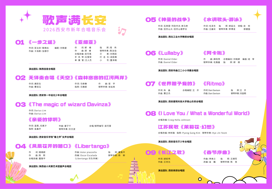 音乐会以“歌声满长安”为主题,汇集全市9支优秀合唱团队,涵盖少年儿童、高校师生、行业职工及退休教授等多类群体,展现西安群众合唱事业的繁荣面貌。演出曲目共18首,风格多元、内涵丰富,既包括《长江之歌》《春节序曲》等经典作品,也有《亚细亚》《世界赠予我的》等新时代歌曲,以及《天空》《ThemagicofwizardDavinza》《Libertango》等无伴奏童声合唱与国际风格曲目,通过合唱艺术传递西安开放包容的城市气质,表达对新年的美好祝愿。