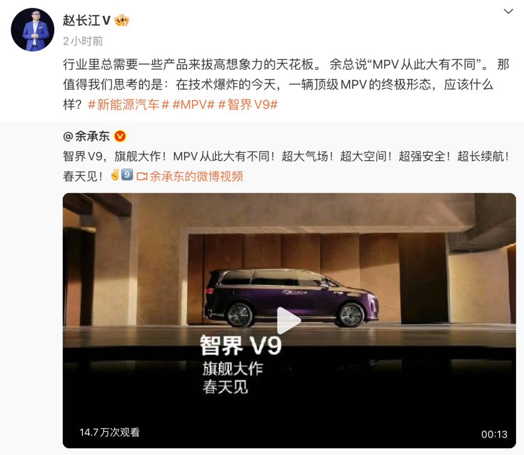 对于智界V9全新车型的表现,今日,华为常务董事、产品投资评审委员会主任、终端BG董事长余承东表示:“智界V9是旗舰大作!MPV从此大有不同!超大气场!超大空间!超强安全!超长续航!”并指出,智界V9将在春天正式亮相。值得一提的是,赵长江转发了余承东的微博,并为智界V9预热,表示“行业里总需要一些产品来拔高想象力的天花板”。有网友在评论区询问赵长江如何评价智界V9这台车,赵长江回复称:“保守估计三年内没有对手。”