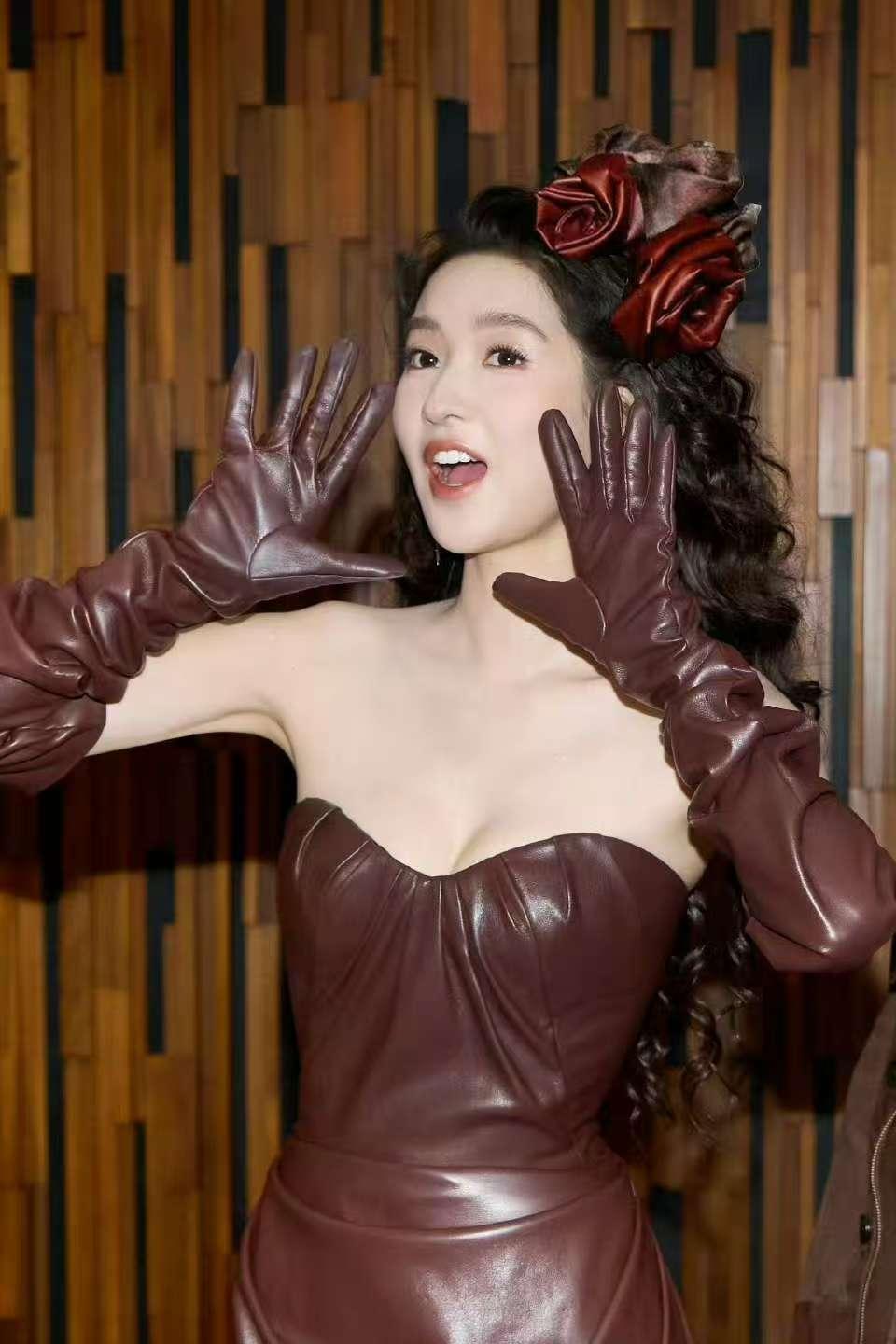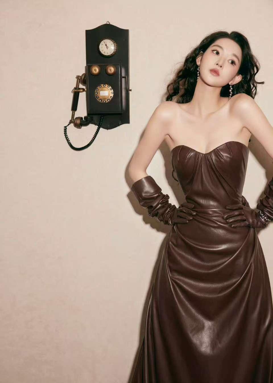 谁能想到王玉雯把复古风玩得这么绝!一组棕皮裙写真释出,直接让网友喊着“内娱复古美人有了新答案”。镜头里的她身着一袭巧克力棕抹胸皮裙,利落的抹胸剪裁狠狠掐出盈盈一握的漫画腰,搭配同色系长皮手套,冷艳又优雅的气质扑面而来。一头蓬松的复古卷发慵懒垂落,衬得她眉眼精致又迷离。往复古电话旁一站,活脱脱从民国画报里走出来的大小姐,这颜值和身材的适配度,简直高到离谱!