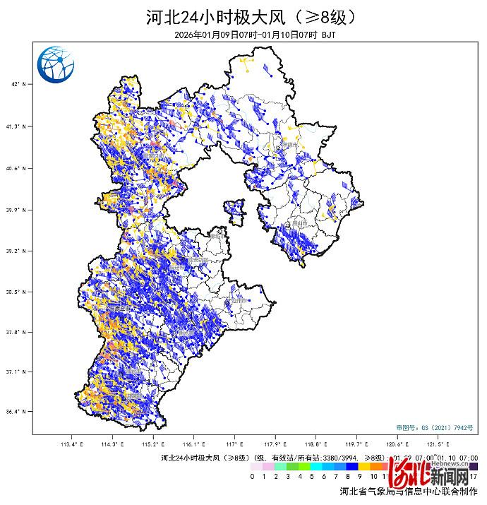 河北新闻网1月10日讯(记者杨佳薇、谭悦)本周,河北天气舞台上演了“极速变脸”。受冷空气影响,河北遭遇大风剧烈降温天气,多地出现7级以上大风。据河北省142个国家级气象站数据统计,1月9日7时至10日7时,全省大部地区风力较大,共有85个国家级气象站出现7级以上大风,其中内丘县风速最大,瞬时风力达11级。