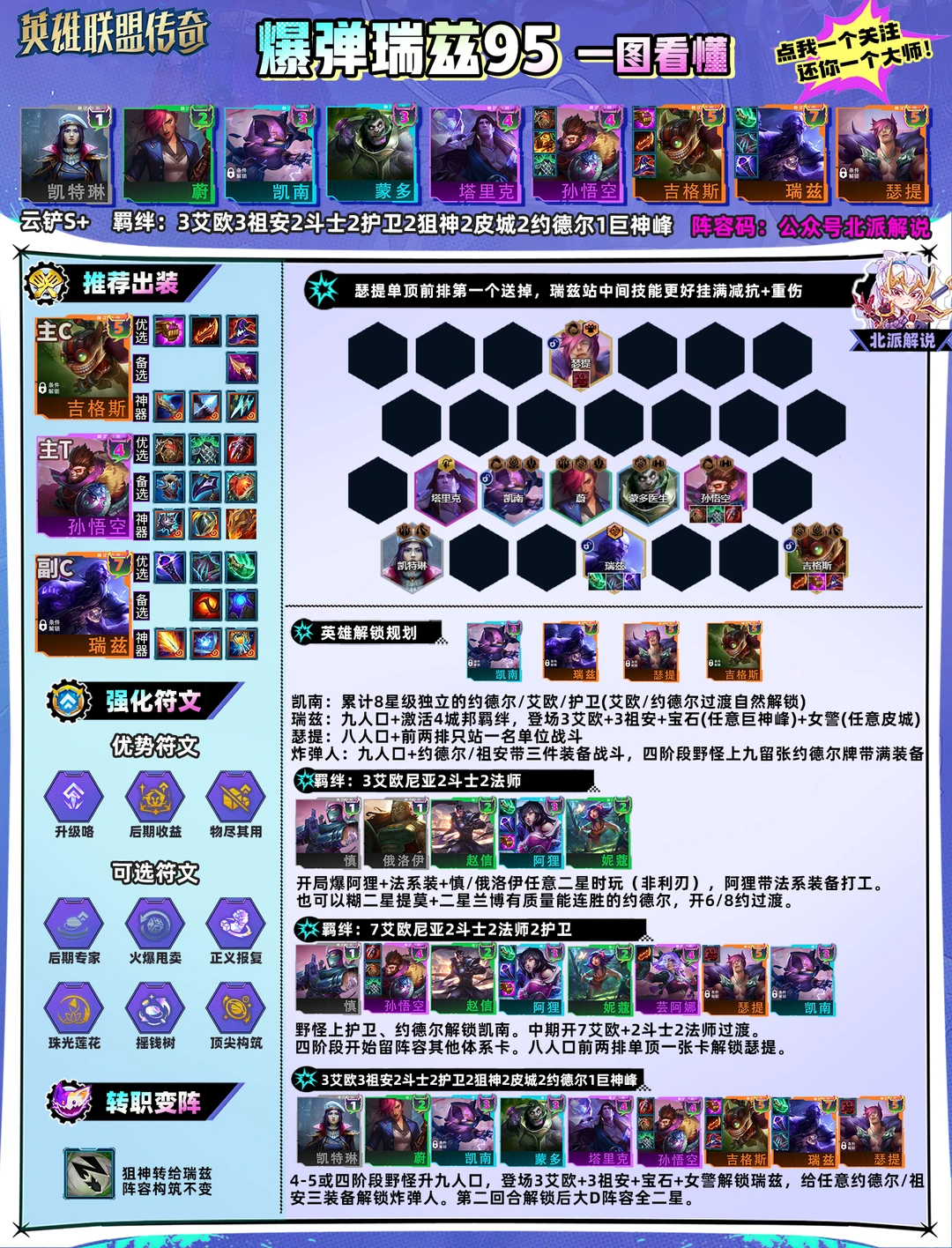 [爆弹瑞兹]过渡思路同[艾玛瑞兹],开局找3艾欧/约德尔过渡(中期解锁凯南很重要!!)八人口解锁瑟提,九人口解锁爆弹&瑞兹阵容即成型,所有五费卡均解锁保底拿一张,不用担心成型不了!
