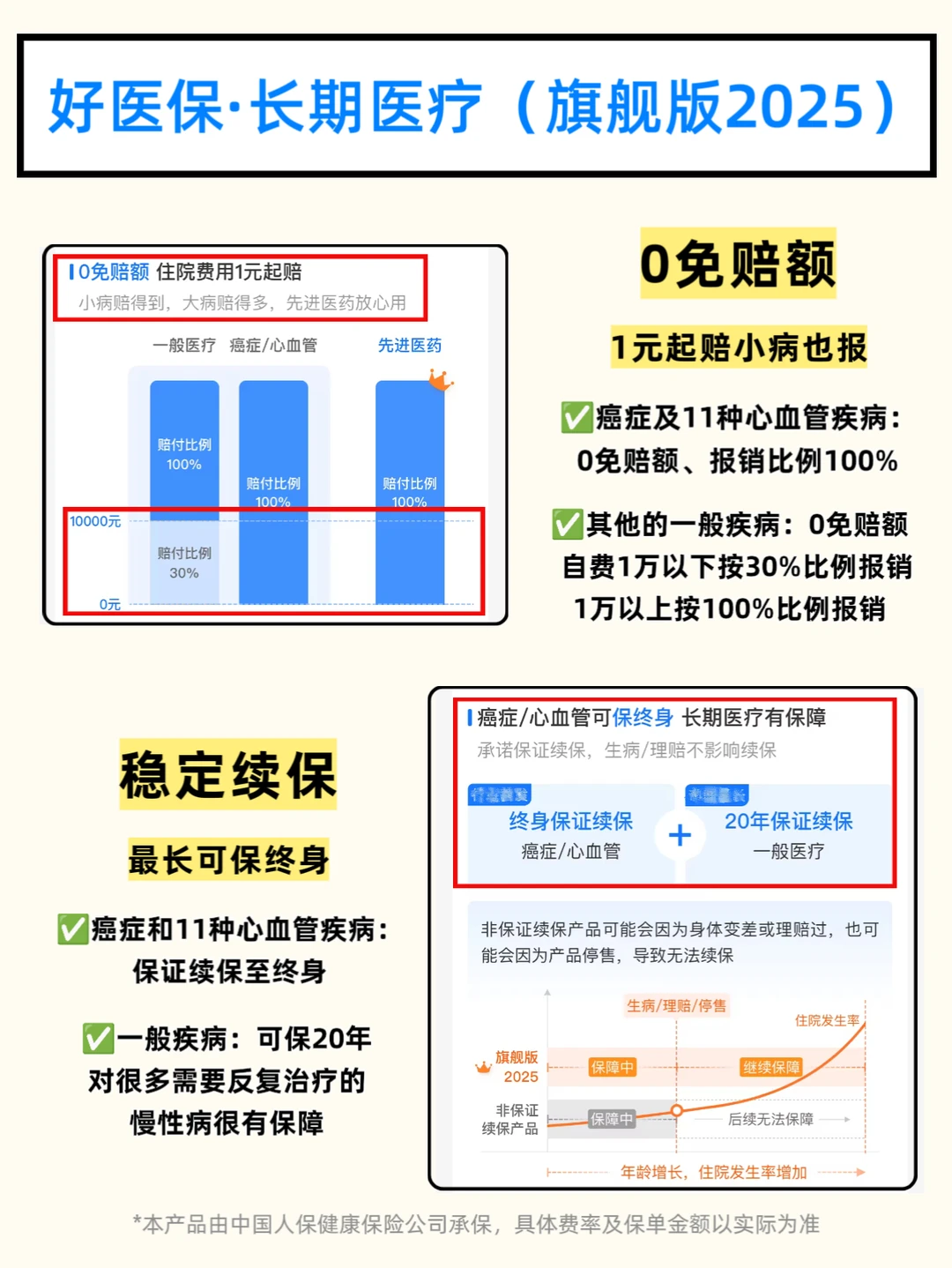 ➡️稳定续保:癌症治疗往往是个长期过程,可能需要反复入院、持续用药。这款医疗险最长可以保一辈子,一般疾病可保20年,而癌症和11种心血管疾病则保证续保至终身,期间不用重复健康告知,即使身体情况变差也能持续获得保障。
