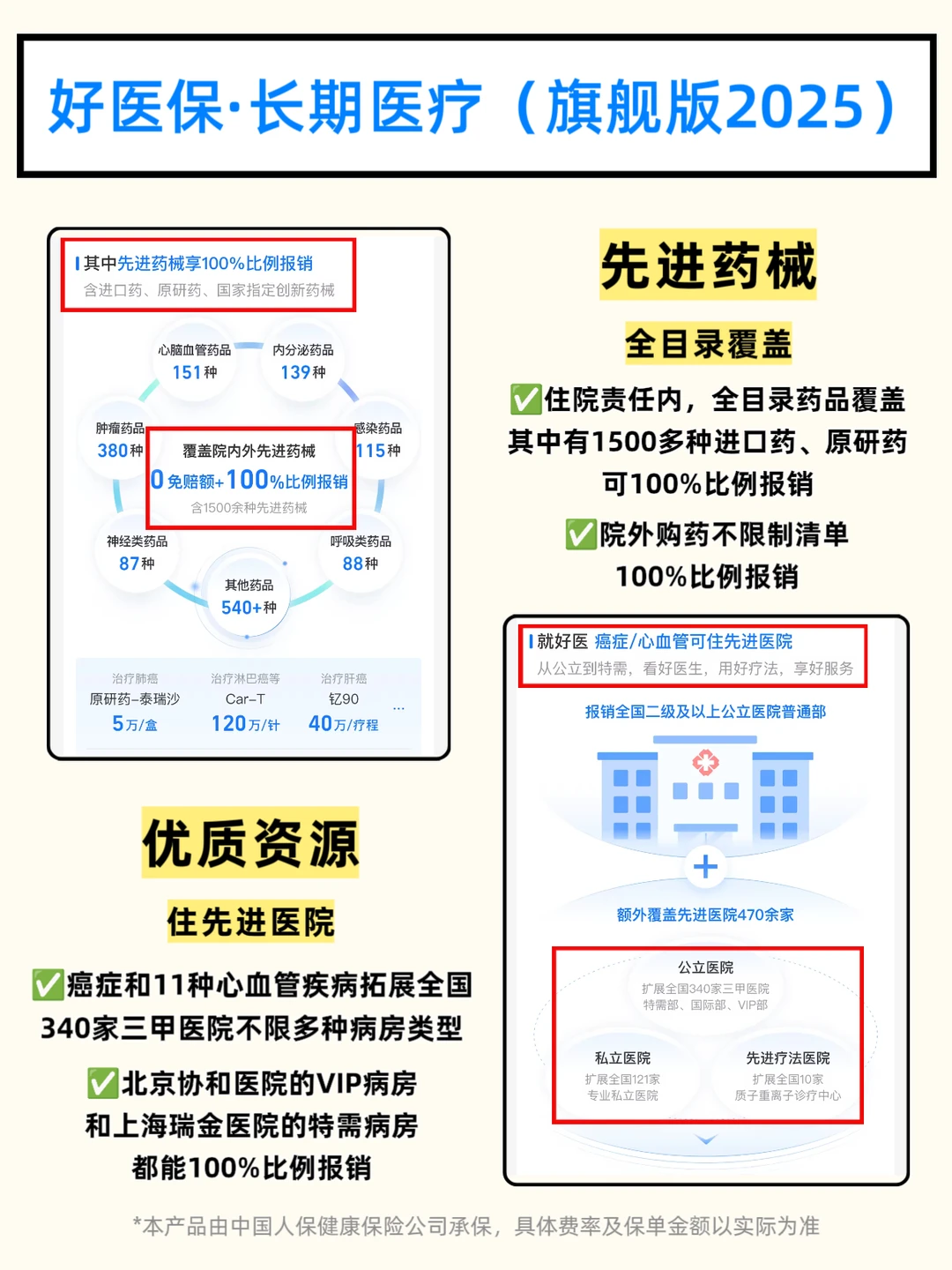 ➡️先进药械:很多癌症靶向药、免疫药医院经常缺货,需院外购买,加上手术中使用的进口器械材料,价格高昂且大多需自费。而这款医疗险在住院责任内全目录药品覆盖,其中有1500多种进口药、靶向药可享100%比例报销,连120万的CAR-T抗癌针也都包含在内,且院外购药不限清单,也能100%比例报销。