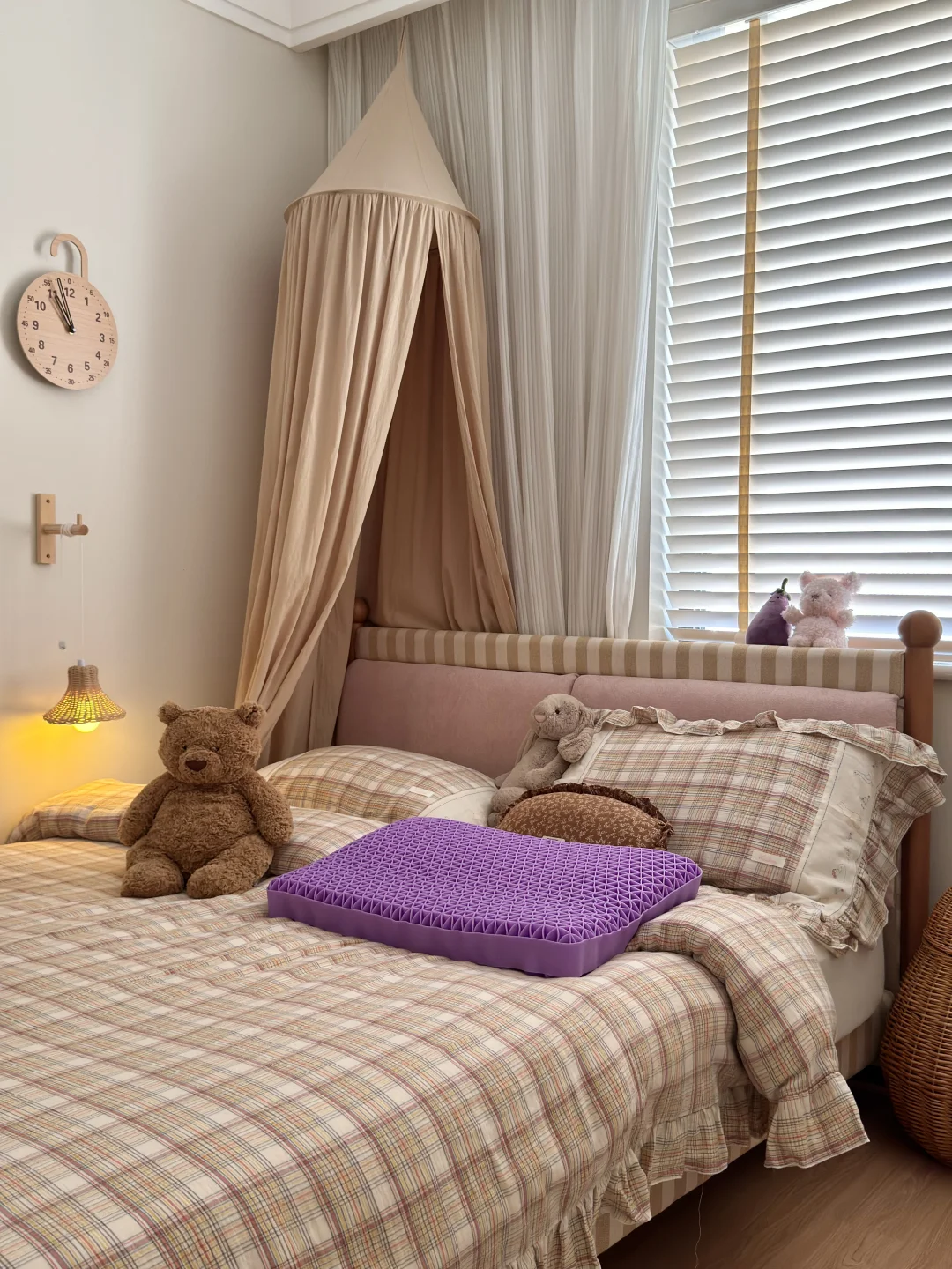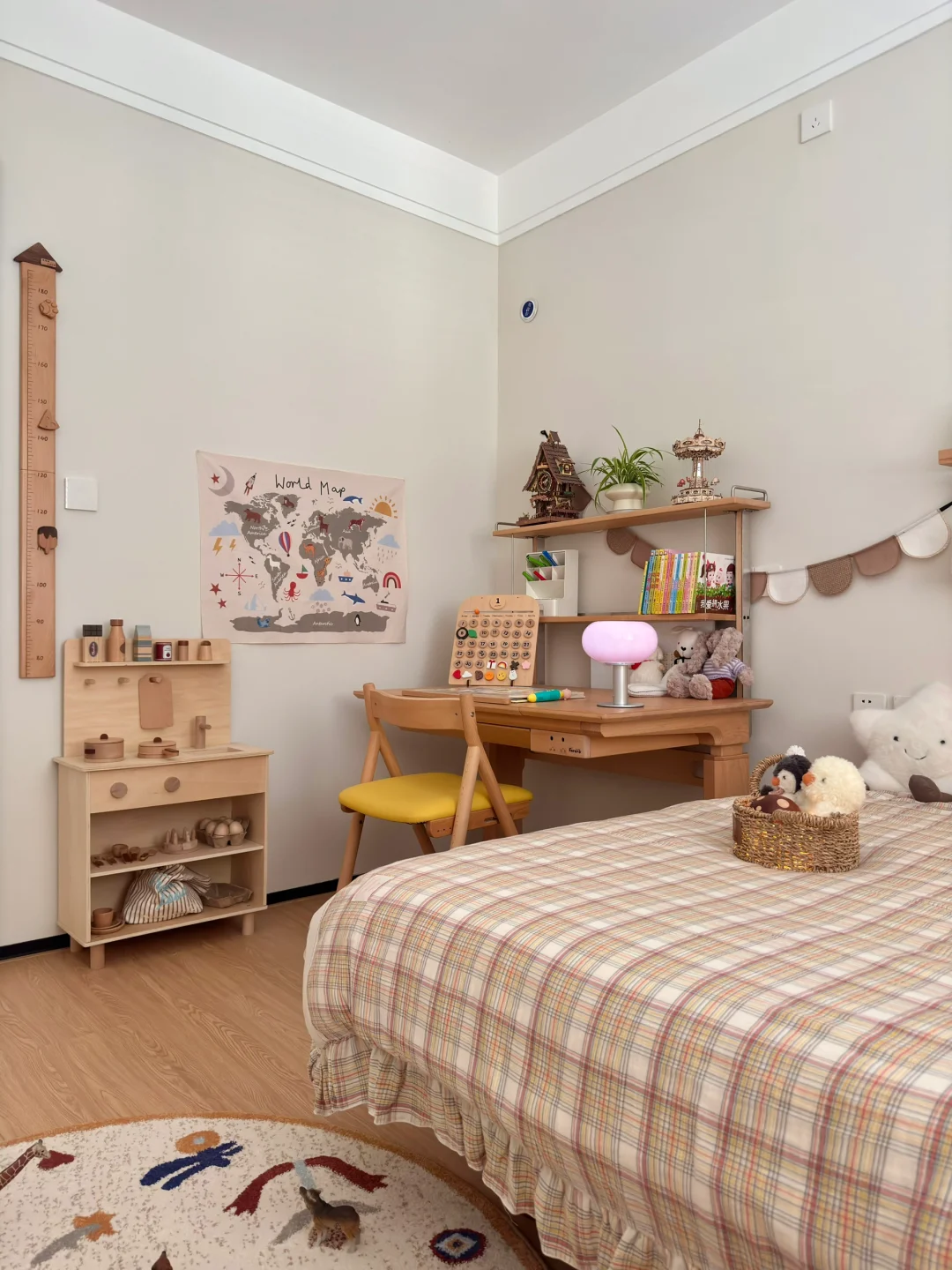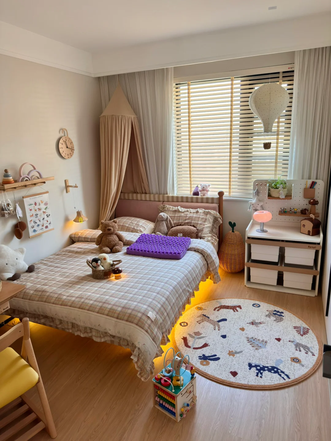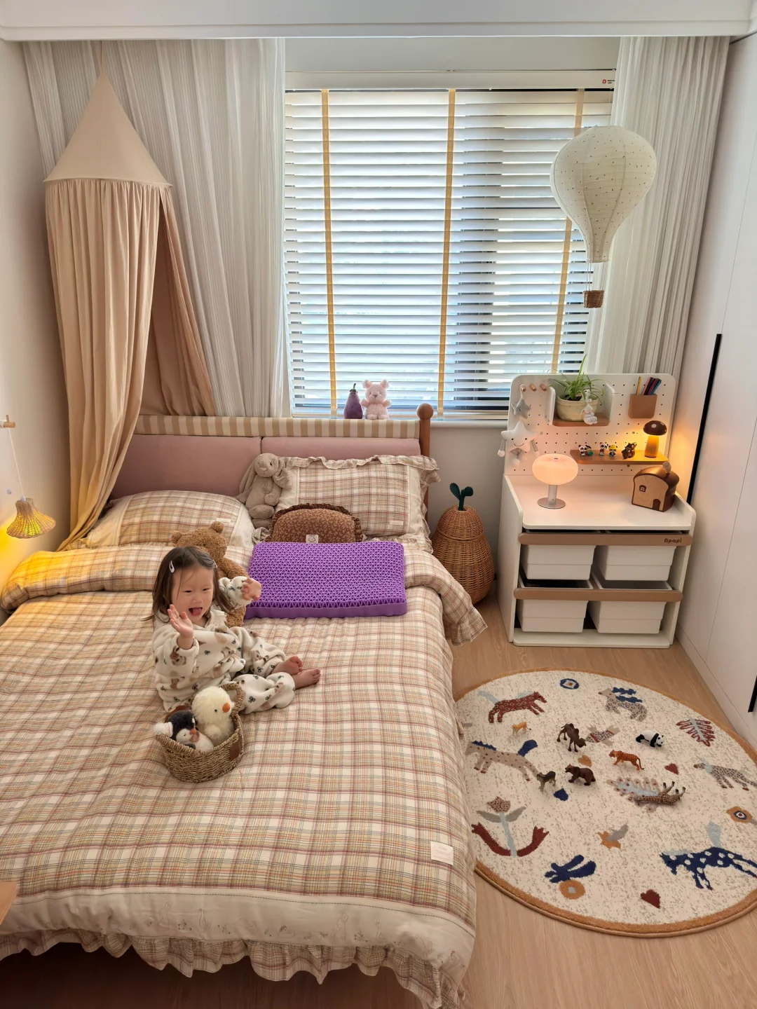 能从2岁用到18岁~ 睡眠区、玩具区、学习区 房间虽小 却也样样俱全~ 关于尺寸: 🛏️:1.5×2m 地毯:直径1.2m 学习桌:1.1m 房间面积:2.7×3.6m