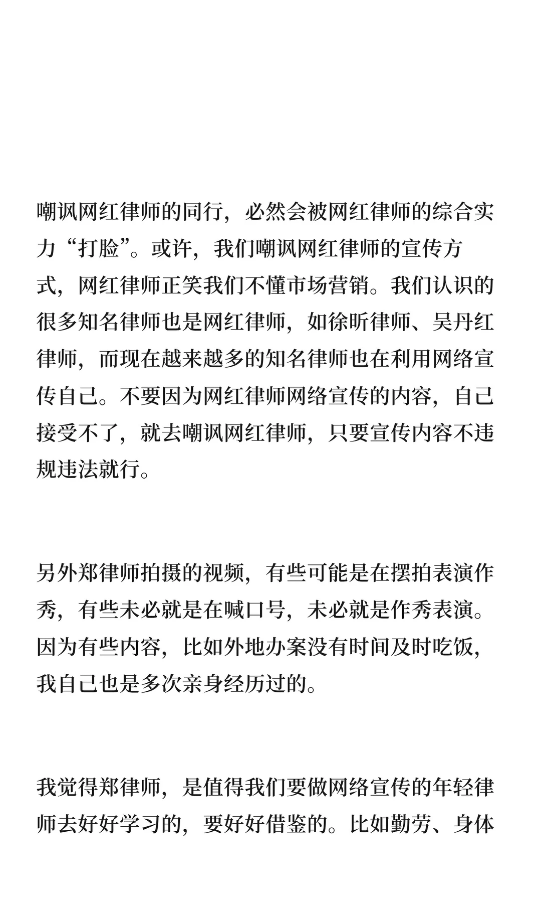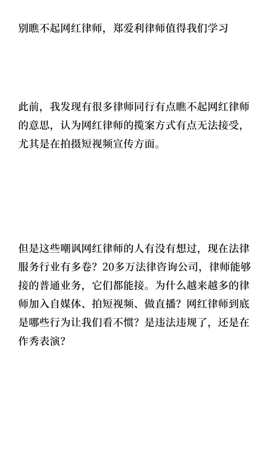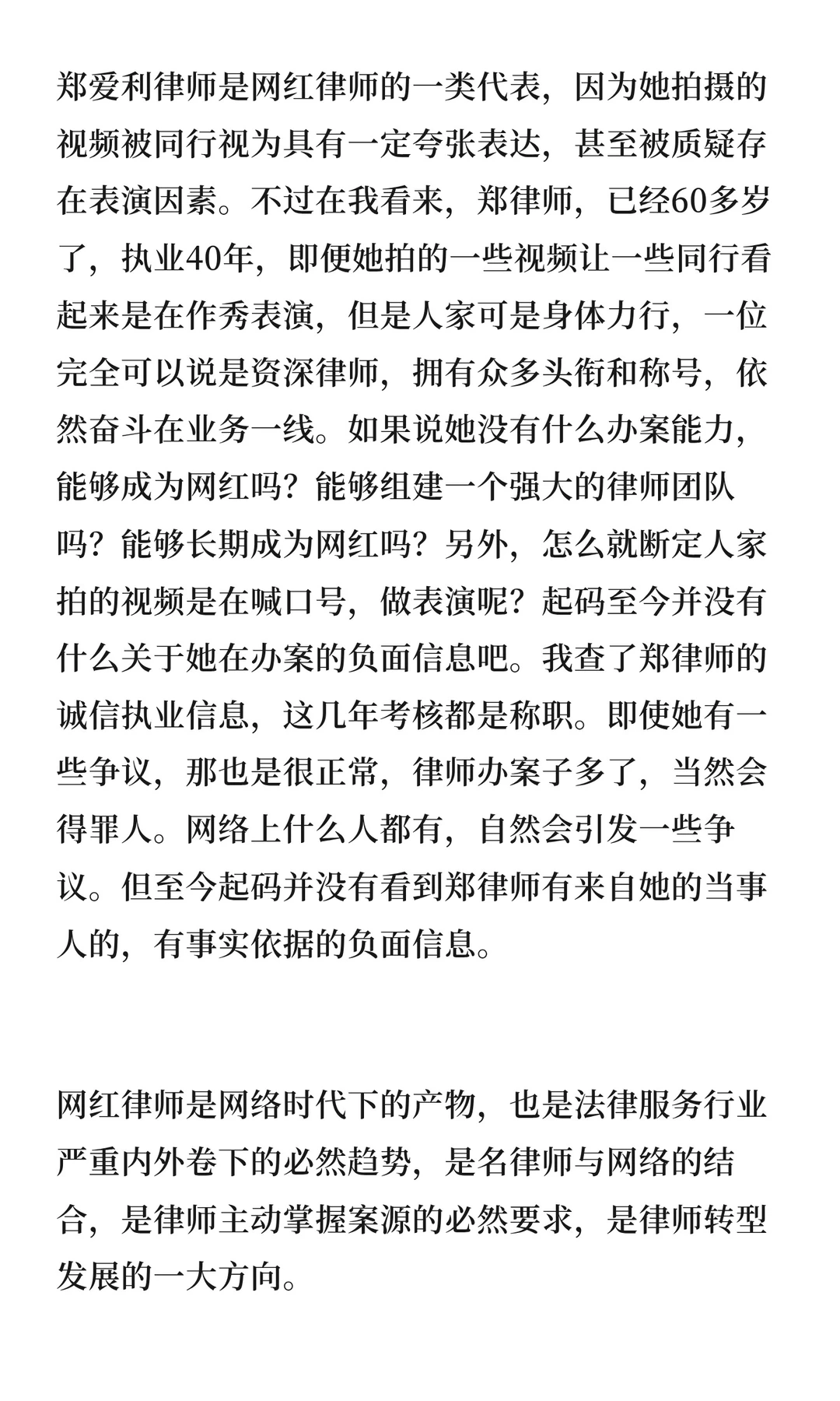 网红律师如郑爱利通过短视频宣传,展现业务能力与市场洞察,值得同行学习。他们的网络策略并非作秀,而是转型与生存的必然选择。嘲讽网红律师的人应反思,真正的律师应具备市场敏感与共情能力。