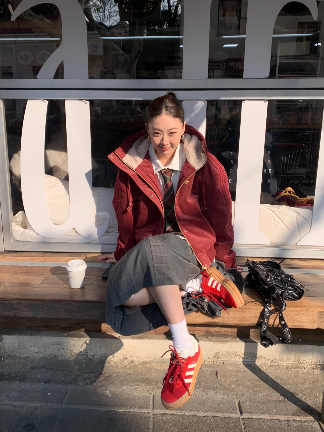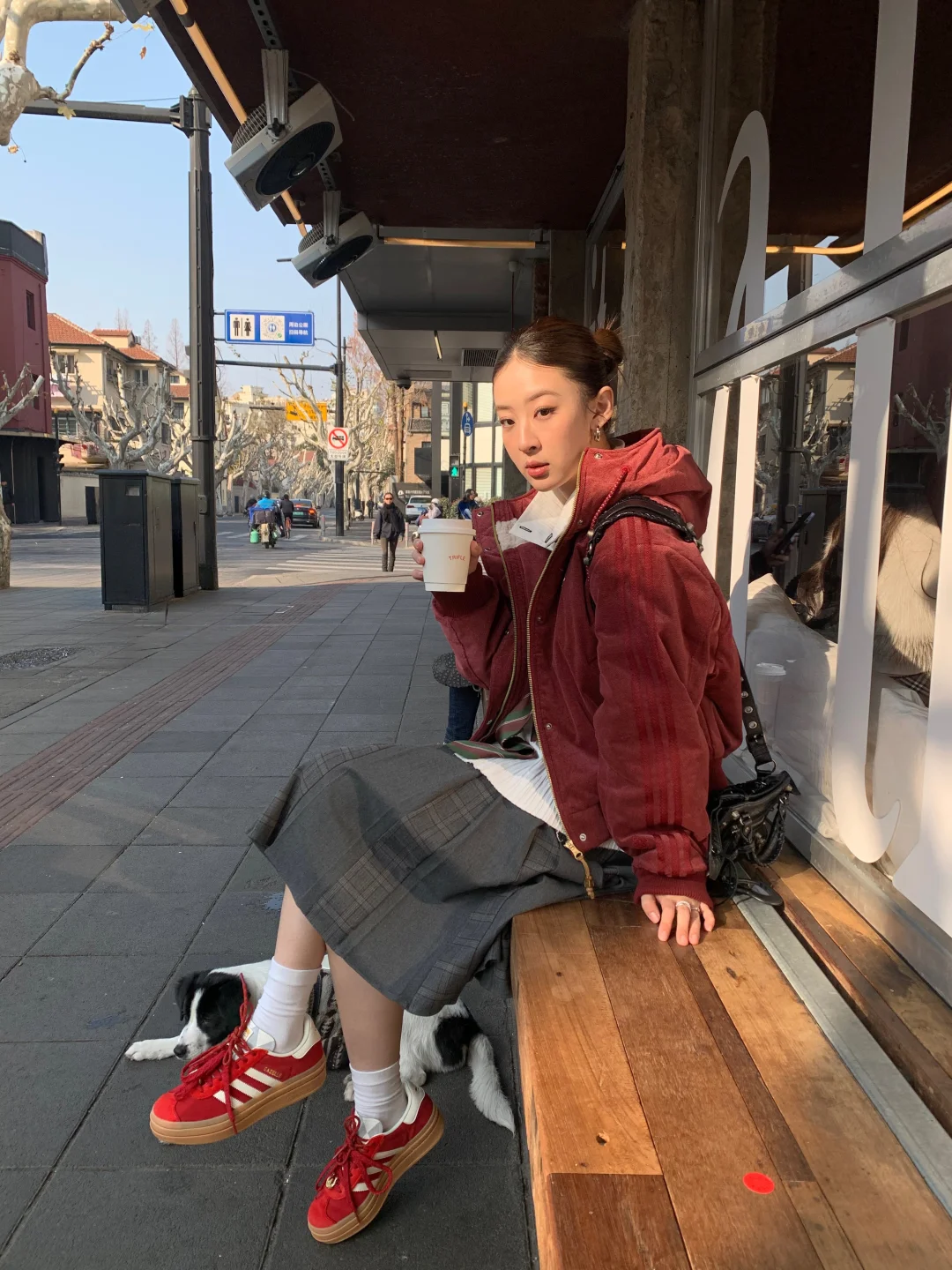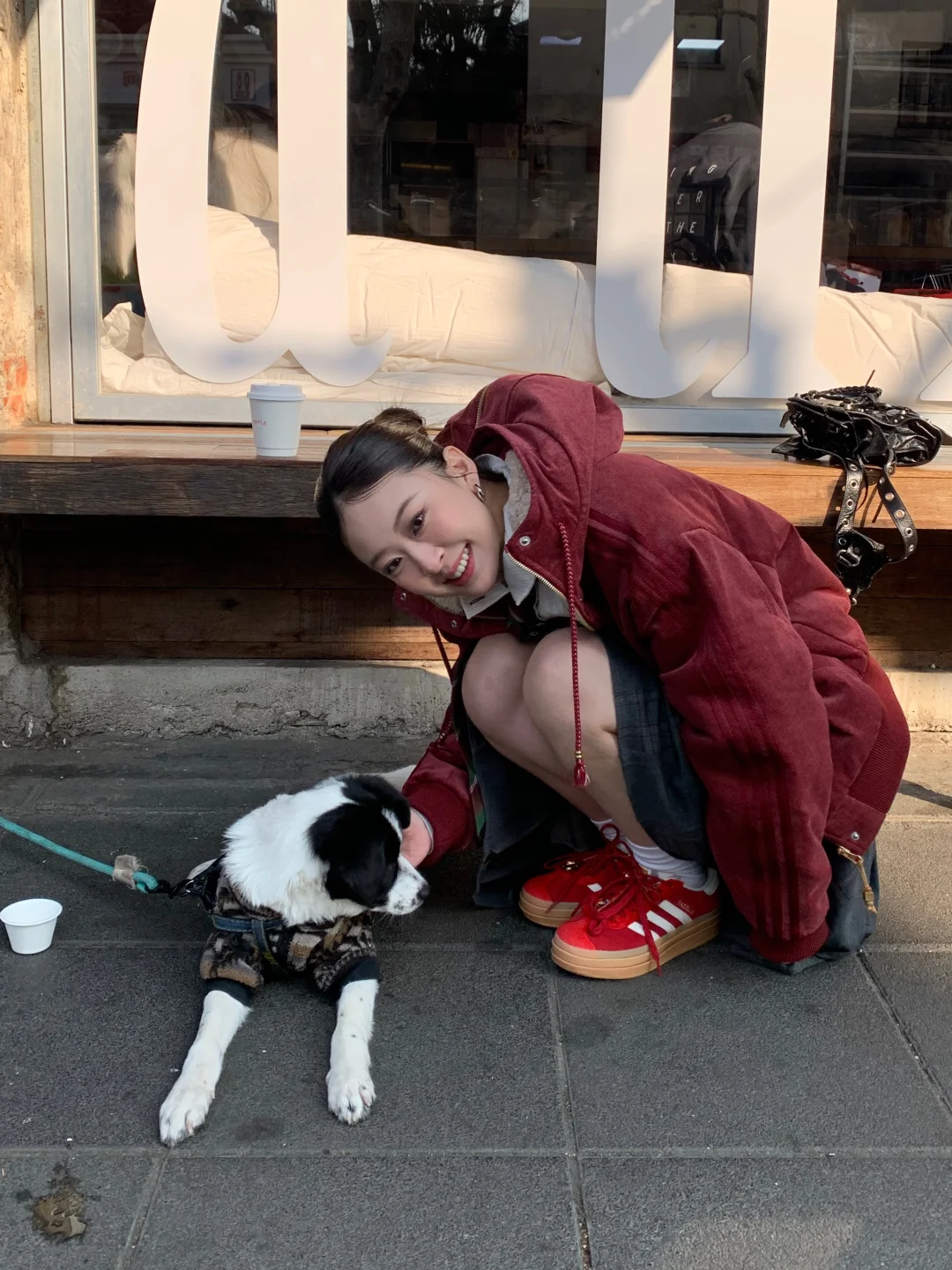 出门溜达喝咖啡 偶遇到了超乖的小狗 配合姐姐拍照拍了好久🥰 新年新气象! 马年给自己安排了一件三叶草红外套 还搭配了马年限定红色T头鞋 希望自己今年可以像这套look一样红红火火,脚步生风