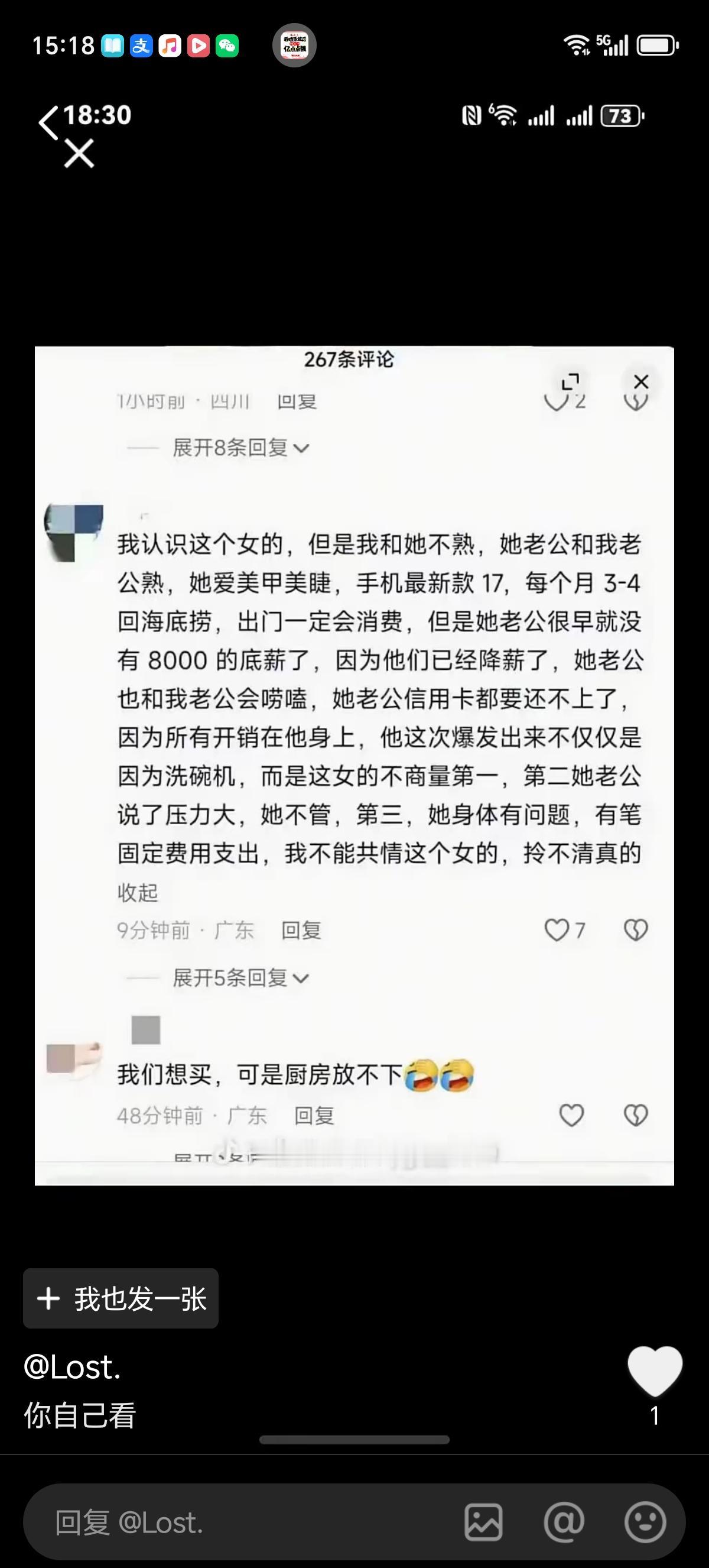 女子的老公只是砸了客厅,厨房是原汁原味的,而且女子的老公早就没有8000的底薪了,已经降薪了,她老公信用卡都要还不上了。 因为女子爱美甲美睫,手机也是最新款的17,每个月3到4回海底捞,出门一定会消费,有网友说她每周还得3到4个榴莲,所有的开销都是她老公来出。 目前女子生病不能上班,还有笔固定的治疗费用,她老公养着一家四口,还有20来万外债。 突然理解了她老公说的水费很贵,电费又很贵,消费不起。 她觉得广东水凉,要买洗碗机,她老公说压力大。好奇广东的气候不是一直很暖和吗?水比东北的还凉吗,还不能烧热水吗。 这厨房里的碗明显没洗,还在水槽里放着,洗碗要用洗碗机洗,洗菜可用啥洗,那水不还是凉的吗?