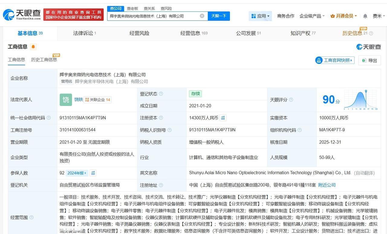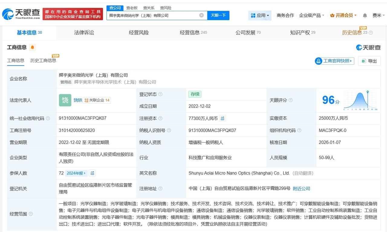 歌尔光学接手舜宇奥来微纳光学公司 歌尔光学再接手舜宇光学旗下一公司 天眼查工商信息显示,近日,舜宇奥来微纳光学(上海)有限公司发生工商变更,原股东舜宇光学旗下宁波舜宇奥来技术有限公司、宁波舜奥自有资金投资合伙企业(有限合伙)、宁波舜承自有资金投资合伙企业(有限合伙)退出,新增歌尔光学科技有限公司为全资股东,叶辽宁卸任法定代表人,由饶轶接任,同时,部分主要人员发生变更。 舜宇奥来微纳光学(上海)有限公司成立于2022年12月,注册资本7.73亿人民币,经营范围包括光学仪器制造、光学玻璃制造、光学仪器销售等。值得一提的是,此前,舜宇奥来微纳光电信息技术(上海)有限公司发生工商变更,原股东宁波舜宇奥来技术有限公司退出,新增歌尔光学科技有限公司为全资股东。 天眼查信息: