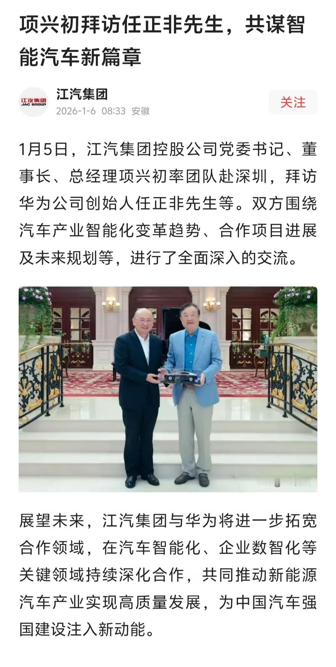 我发现,现在夸一辆车牛逼,最高级的说法已经变了。 以前得扯什么百年品牌,皇室血统。 现在只需要一句话:任总拿着它的车模合过影。 就这张照片,比砸几个亿的广告都好使。你就想,华为门口来来去去多少车企老板?谁有这个待遇?偏偏是江淮项总去的时候,任总乐呵呵地拿起了尊界S800的模型。 这信号,够直白了吧? 说白了,尊界这车,在华为心里分量不一样。它不是什么简单的“华为赋能”,它是华为团队亲自下场主导操刀的第一款百万豪车。江淮这次,更像是来交作业的,而任总这表情,看样子是满意了。 成绩单也确实漂亮。 上个月交付破了4000台,听说这个月还得往上窜。百万级别的车啊,一个月干别人一年的量。之前谁敢想,国产车卖到这个价,还能把BBA的盘子撬得叮当响? 但最实在的,还得是算股价这笔账。 一个小小车模背后,江淮的股价从十块钱一路干到过58。项总合照时那笑,是发自内心的。这哪是模型,这是真金白银的印钞机。 前几天项总在一个会上聊嗨了,回忆说三年前要做百万豪车,有人泼冷水,说人家故事都讲了一百年了,你凭啥? 项总回得硬气:难道我得先活一百岁才能开工?故事不都是人现写的吗? 这话有底气。底气来自哪儿?看看台下坐的是谁,看看谁在给他撑腰就明白了。 华为这回,不只是给技术。那是从产线到品控,全链路深度“包办”。甚至自己公司都采购了一大批尊界当接待用车。这叫啥?这叫“扶上马,还得亲自送你跑一程”。 所以尊界这车,你看它卖得好,真不只是车本身的事儿。 它像是个展示柜。里面摆着的,是华为攒了多年的智能汽车全套解决方案,是中国一整套高端供应链突然打通任督二脉后能爆发出的水准。 平均售价90万,七成订单冲顶配,车主还一堆90后。这画面,三年前没人能画出来。 现在回头看任总手里那个车模。 它安静的,但好像又什么都说了。说品牌,说股价,说销量,也说清楚了这两年汽车圈权力转移的核心逻辑。 一个新时代的故事,开头往往就这么简单。 一张合影,足矣。