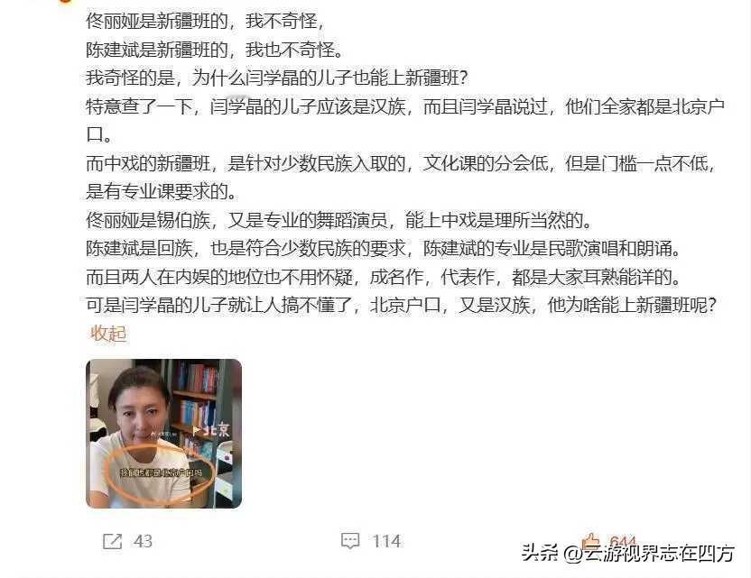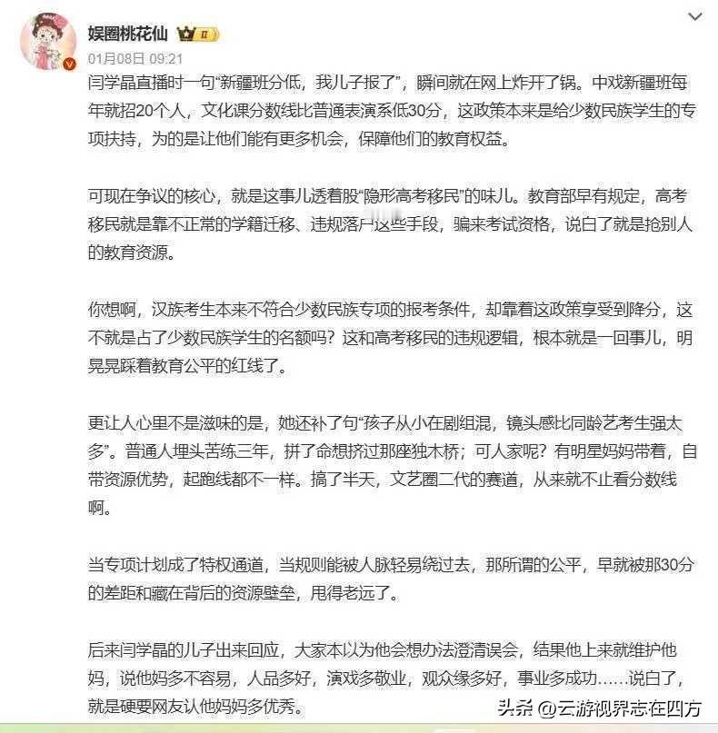 哭穷卖惨的闫学晶, 终究栽在儿子的新疆班学籍上! 年入几十万哭着喊不够花, 转头就被扒出儿子拿着北京户口、 占着新疆少数民族的教育名额。 闫学晶这场“穷人”闹剧, 彻底把教育公平的遮羞布撕了个粉碎。 中戏新疆班从来不是谁都能钻的空子。政策白纸黑字写着“户籍、学籍、实际就读三统一”,面向的是边疆少数民族学子,毕业后还要定向回疆服务。佟丽娅是锡伯族,靠着扎实舞技考上;陈建斌是回族,挤三天三夜硬座来京求学,两人都规规矩矩履约。可林傲霏一个汉族娃,北京户口没迁过,新疆校园没踏过,却能踩着这个“分数洼地”入学,毕业后还直接攥着央视资源拍戏,定向委培成了一纸空文。 这哪里是“努力逆袭”,分明是特权开路。教育部三令五申严禁空挂学籍、人籍分离,林傲霏的新疆学籍从何而来?是学校开了绿灯,还是有人暗箱操作?闫学晶团队不回应、不解释,只会关评论、删视频、告网友,这心虚的样子,比她直播哭穷还难看。 教育公平是老百姓心里的一杆秤,新疆班的名额,是边疆孩子改变命运的梯子,不是明星子女走捷径的滑梯。今日不把这事查个水落石出,明天就有更多特权者效仿。毕竟,钻空子的成本太低,伤的却是无数寒门学子的心。
